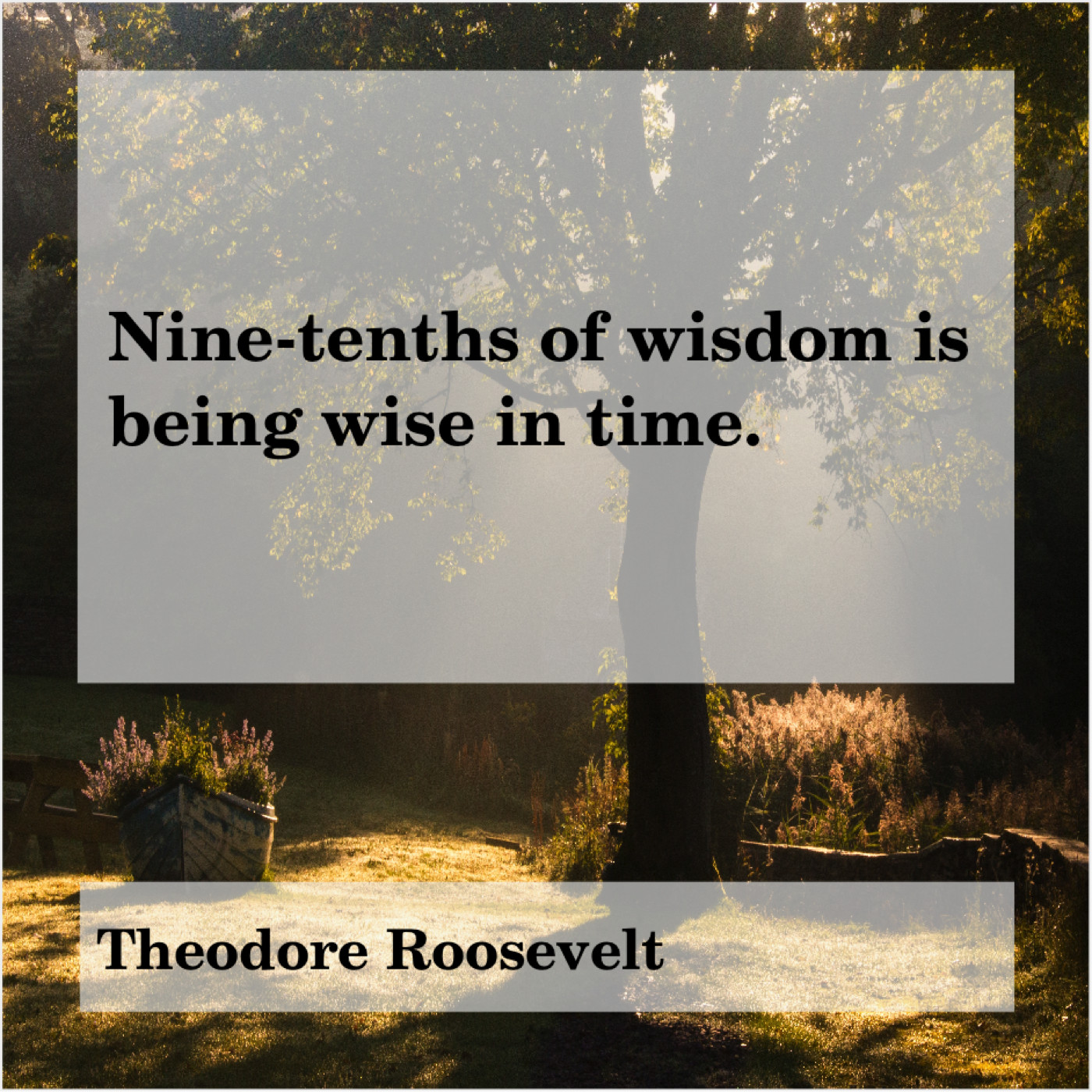 Theodore Roosevelt Theodore Roosevelt – Nine-tenths of wisdom is… October 27, 2018 admin “Nine-tenths of wisdom is being wise in time.”-Theodore Roosevelt