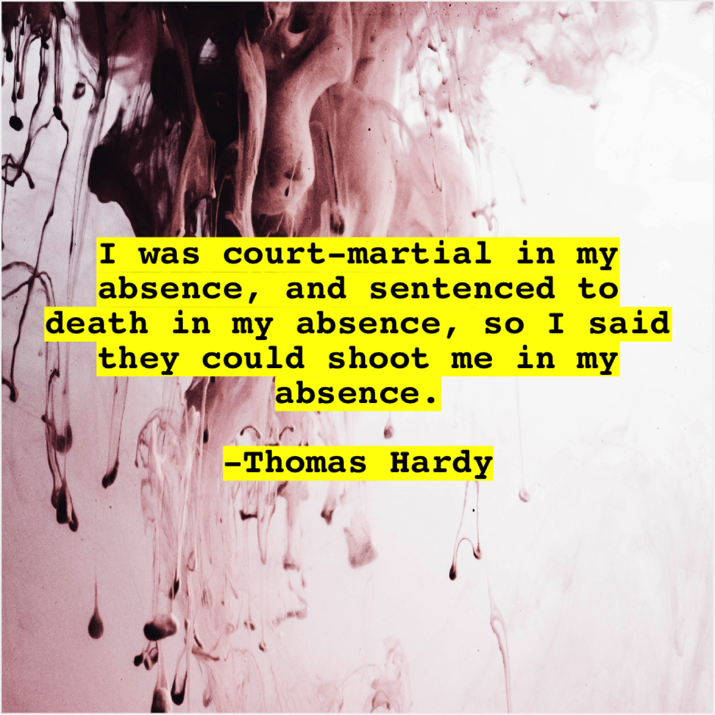 Thomas Hardy Thomas Hardy – I was court-martial in… September 7, 2019 admin “I was court-martial in my absence, and sentenced to death in my absence, so I said they could shoot me in my absence.”-Thomas Hardy