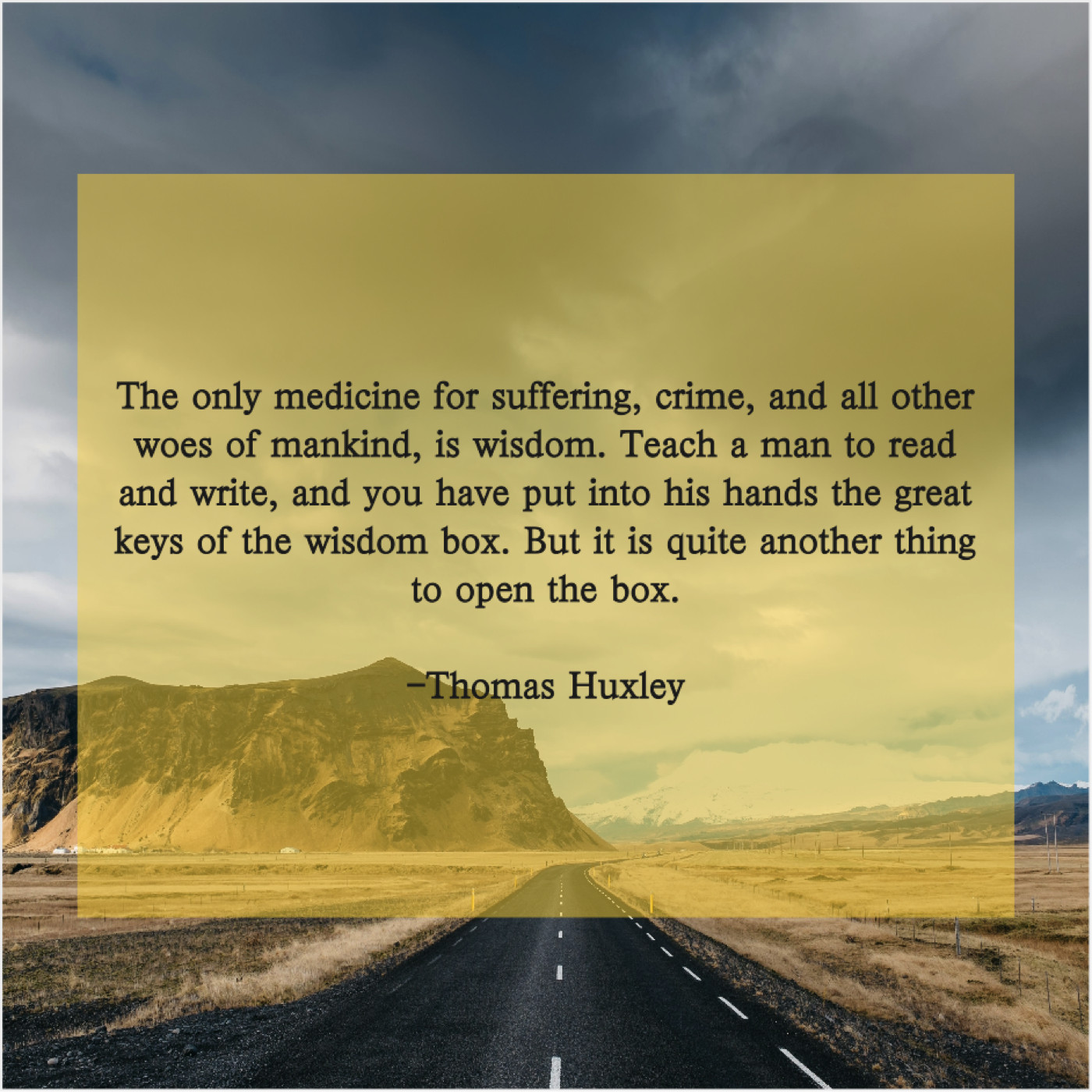 Thomas Huxley Thomas Huxley – The only medicine for suffering… March 3, 2019 admin “The only medicine for suffering, crime, and all other woes of mankind, is wisdom. Teach a man to read and write, and you have put into his hands the great keys of the wisdom box. But it is quite another thing to open the box.”-Thomas Huxley