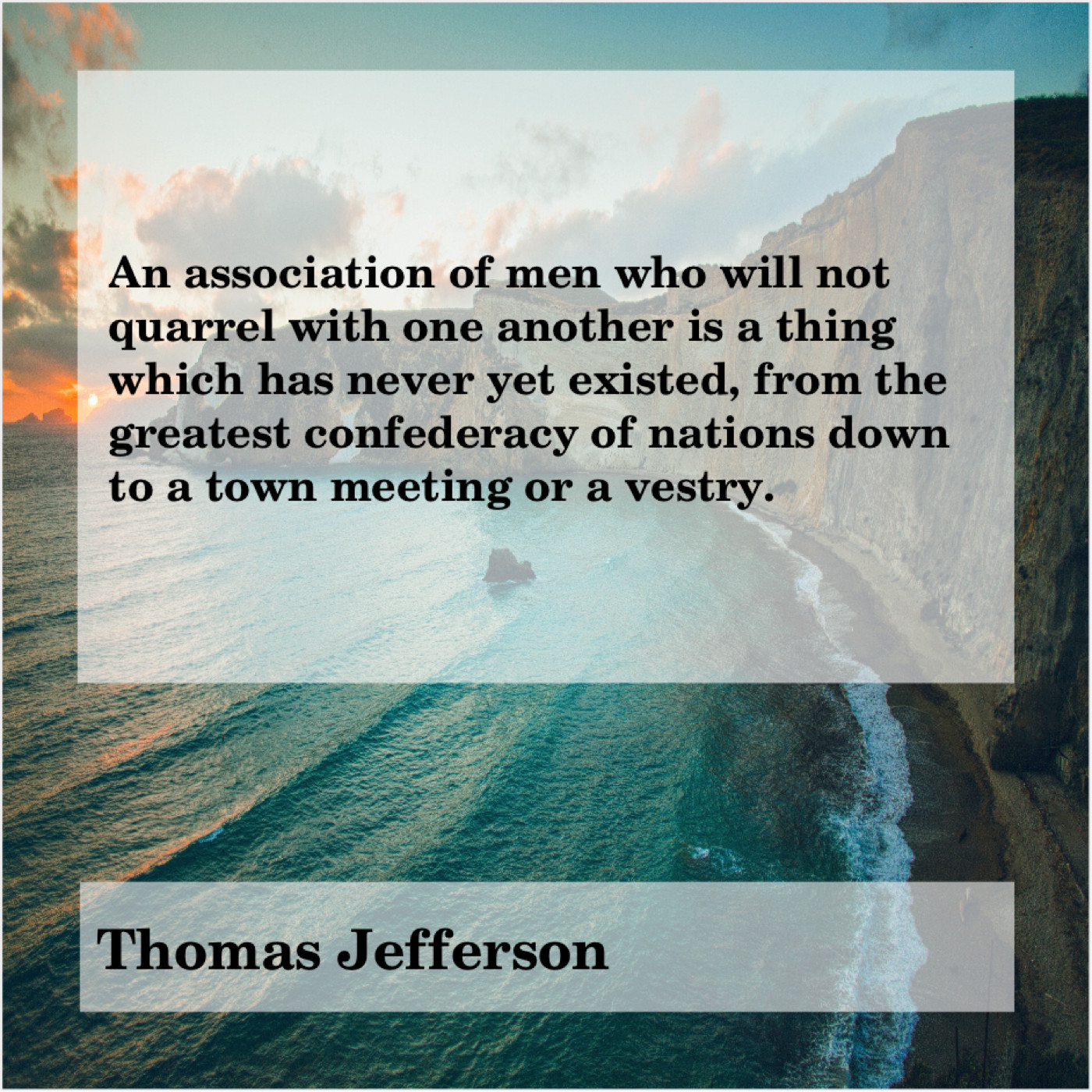 Thomas Jefferson Thomas Jefferson – An association of men who… January 22, 2019 admin “An association of men who will not quarrel with one another is a thing which has never yet existed, from the greatest confederacy of nations down to a town meeting or a vestry.”-Thomas Jefferson