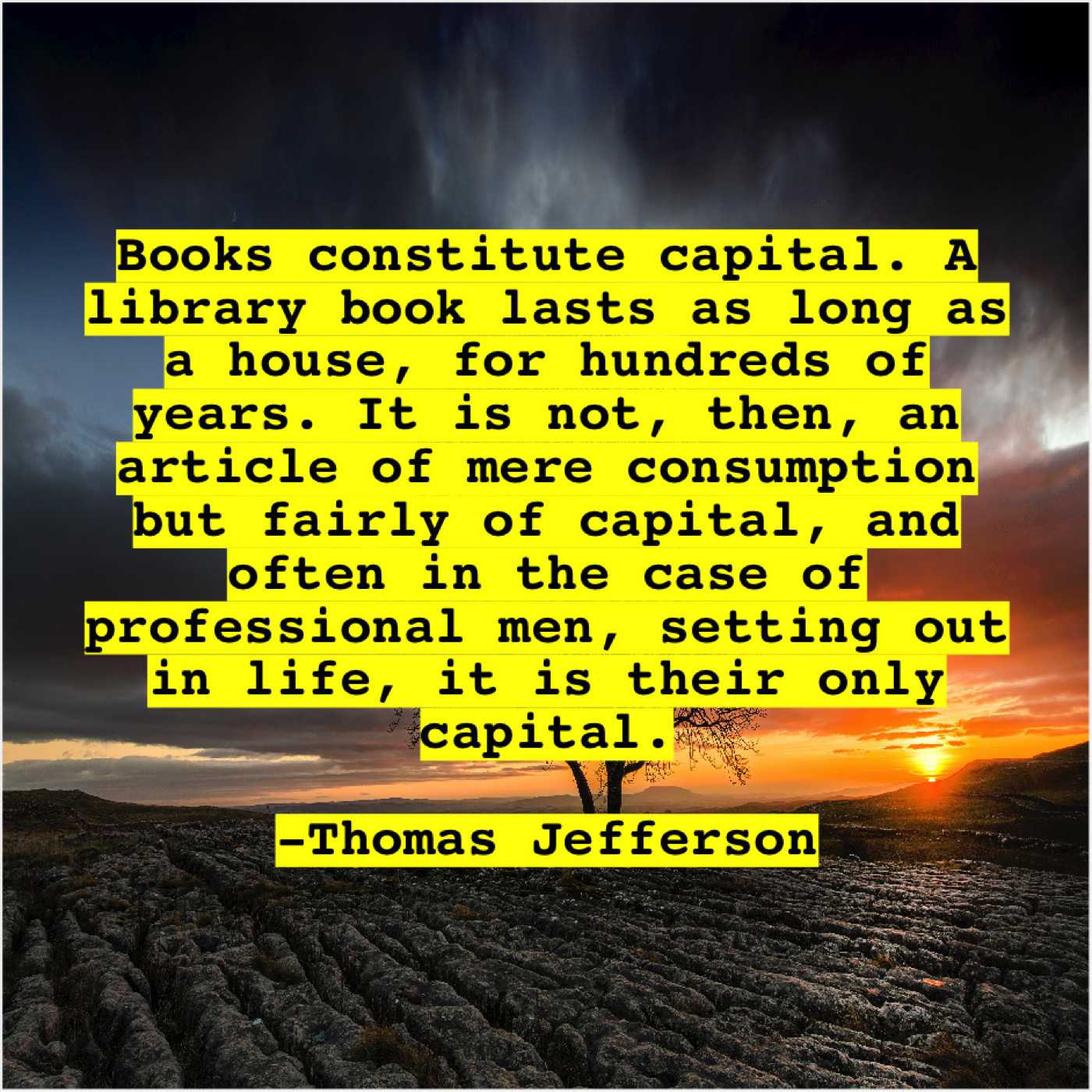 “Books constitute capital. A library book lasts as long as a house, for hundreds of years. It is not, then, an article of mere consumption but fairly of capital, and often in the case of professional men, setting out in life, it is their only capital.”