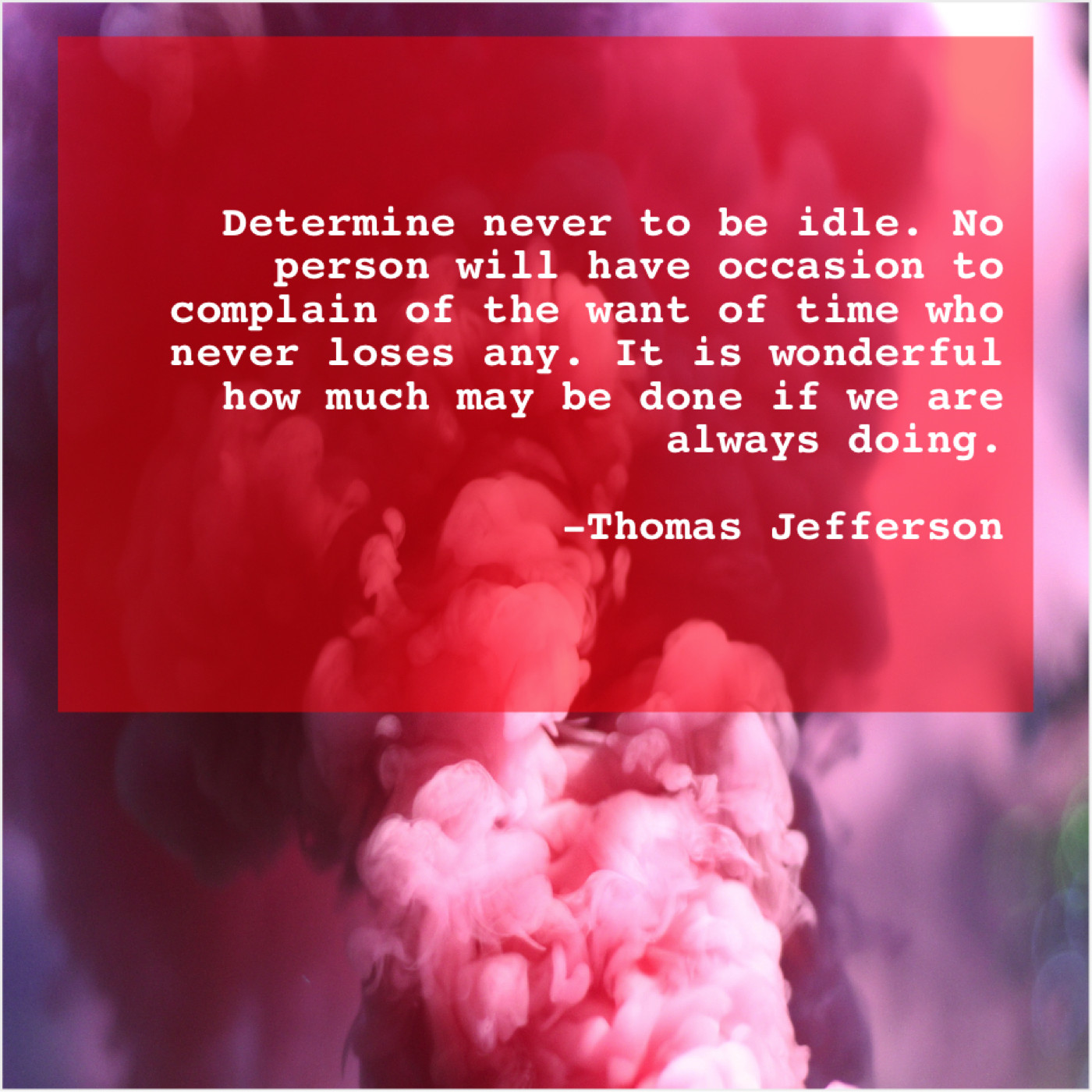 Thomas Jefferson Thomas Jefferson – Determine never to be idle… June 7, 2019 admin “Determine never to be idle. No person will have occasion to complain of the want of time who never loses any. It is wonderful how much may be done if we are always doing.”-Thomas Jefferson