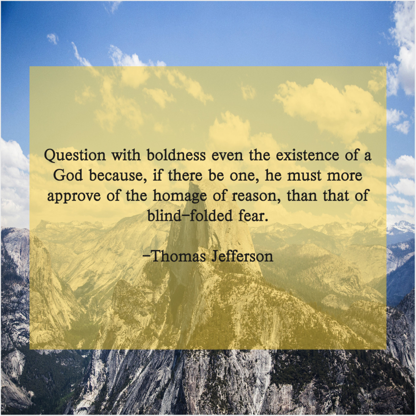 Thomas Jefferson Thomas Jefferson – Question with boldness even the… February 9, 2019 admin “Question with boldness even the existence of a God because, if there be one, he must more approve of the homage of reason, than that of blind-folded fear.”-Thomas Jefferson