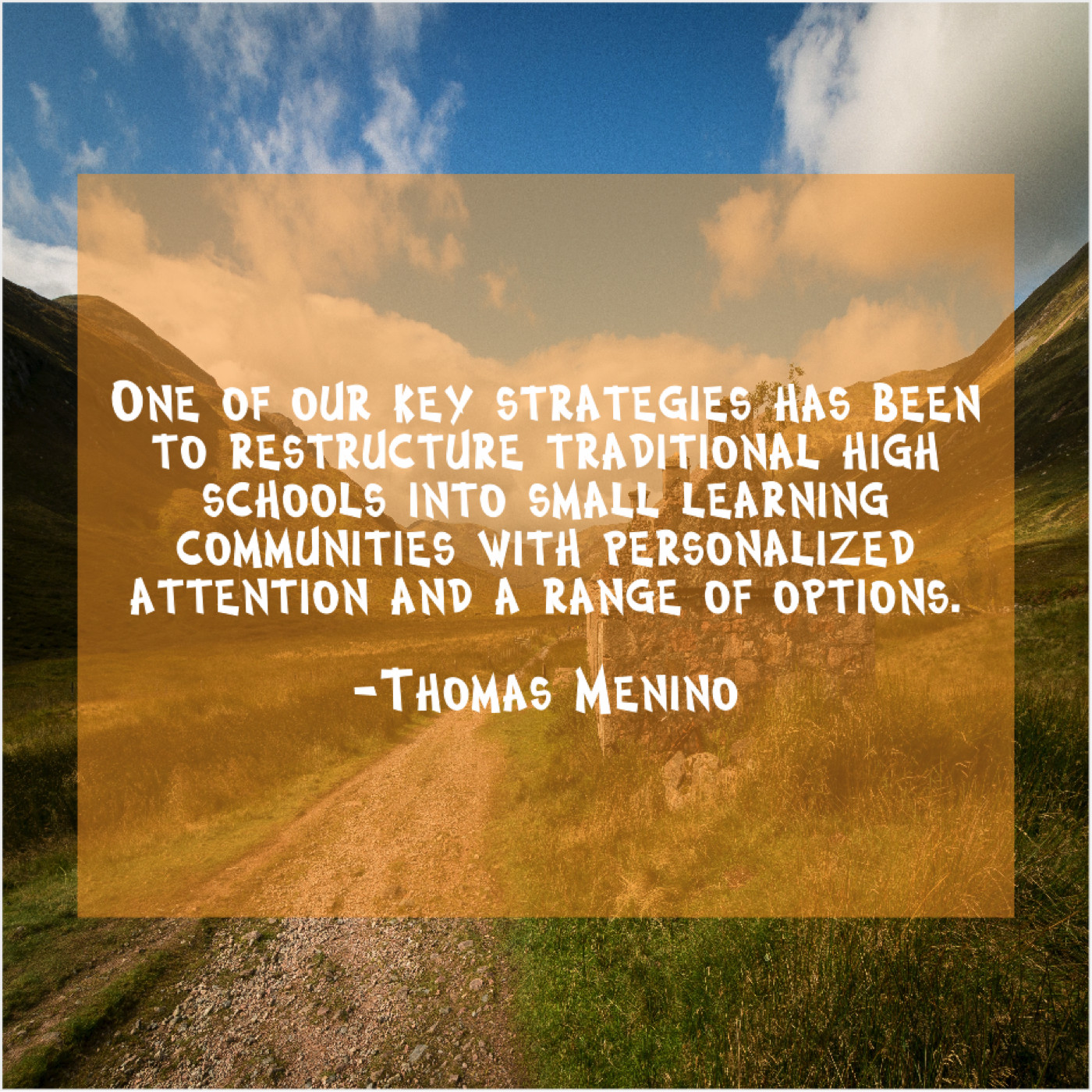Thomas Menino Thomas Menino – One of our key strategies… June 28, 2019 admin “One of our key strategies has been to restructure traditional high schools into small learning communities with personalized attention and a range of options.”-Thomas Menino