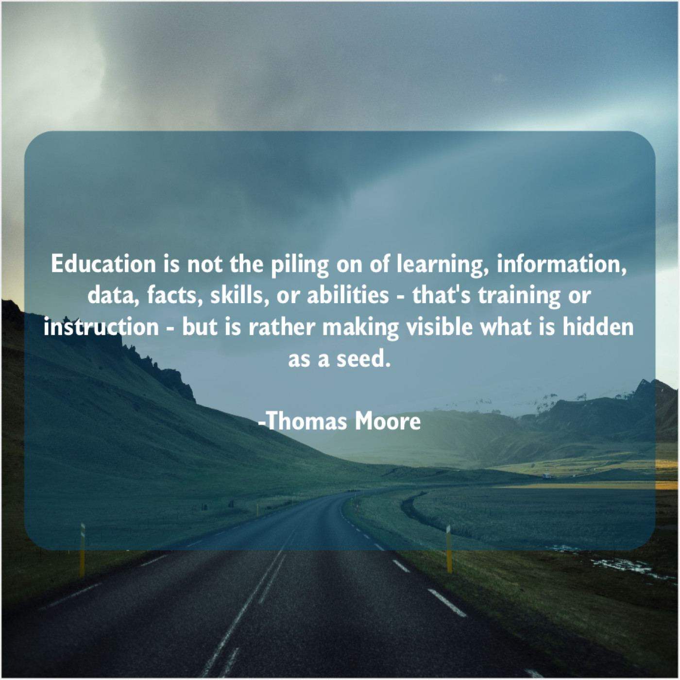 Thomas Moore Thomas Moore – Education is not the piling… August 13, 2019 admin “Education is not the piling on of learning, information, data, facts, skills, or abilities – that’s training or instruction – but is rather making visible what is hidden as a seed.”-Thomas Moore