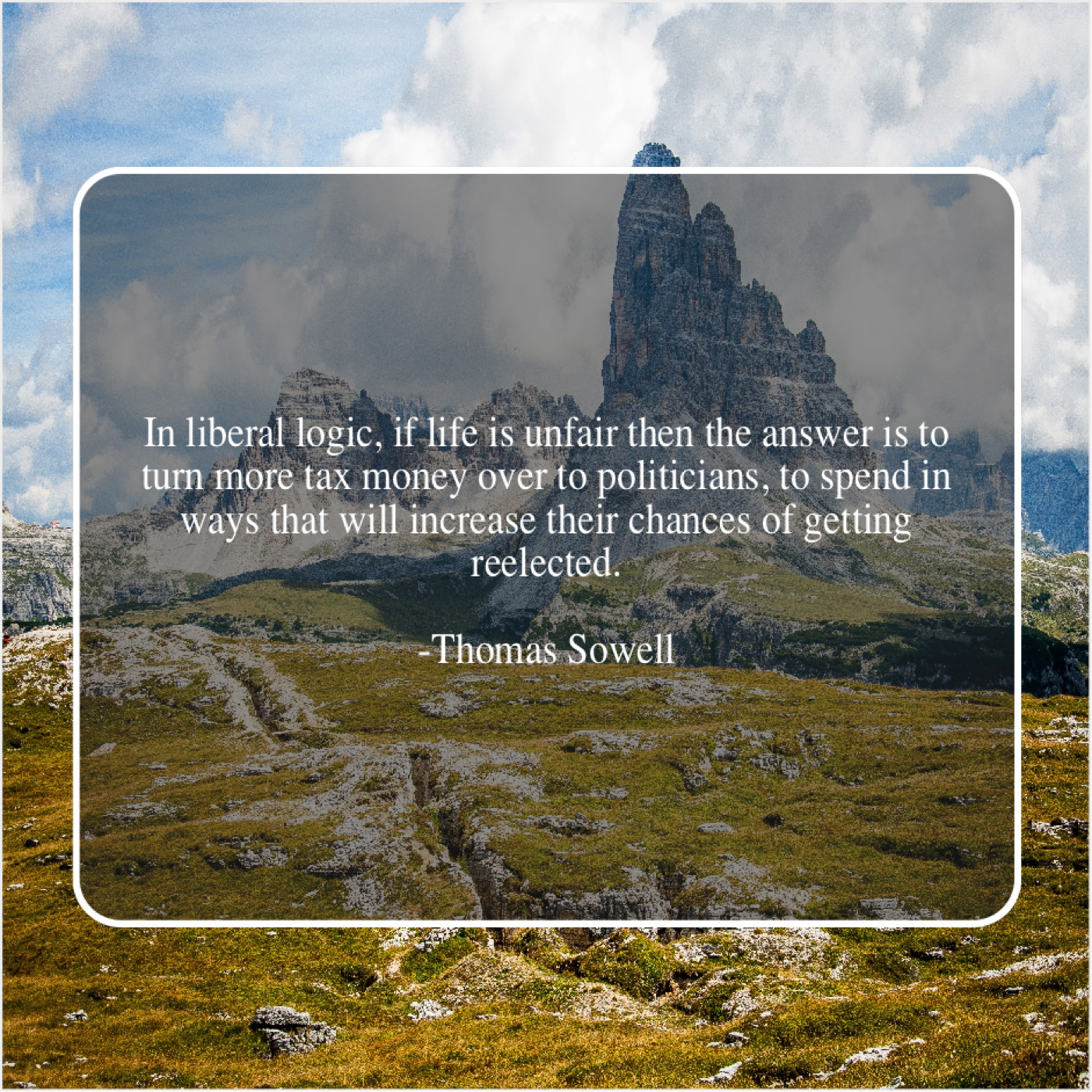 Thomas Sowell Thomas Sowell – In liberal logic, if life… January 29, 2019 admin “In liberal logic, if life is unfair then the answer is to turn more tax money over to politicians, to spend in ways that will increase their chances of getting reelected.”-Thomas Sowell
