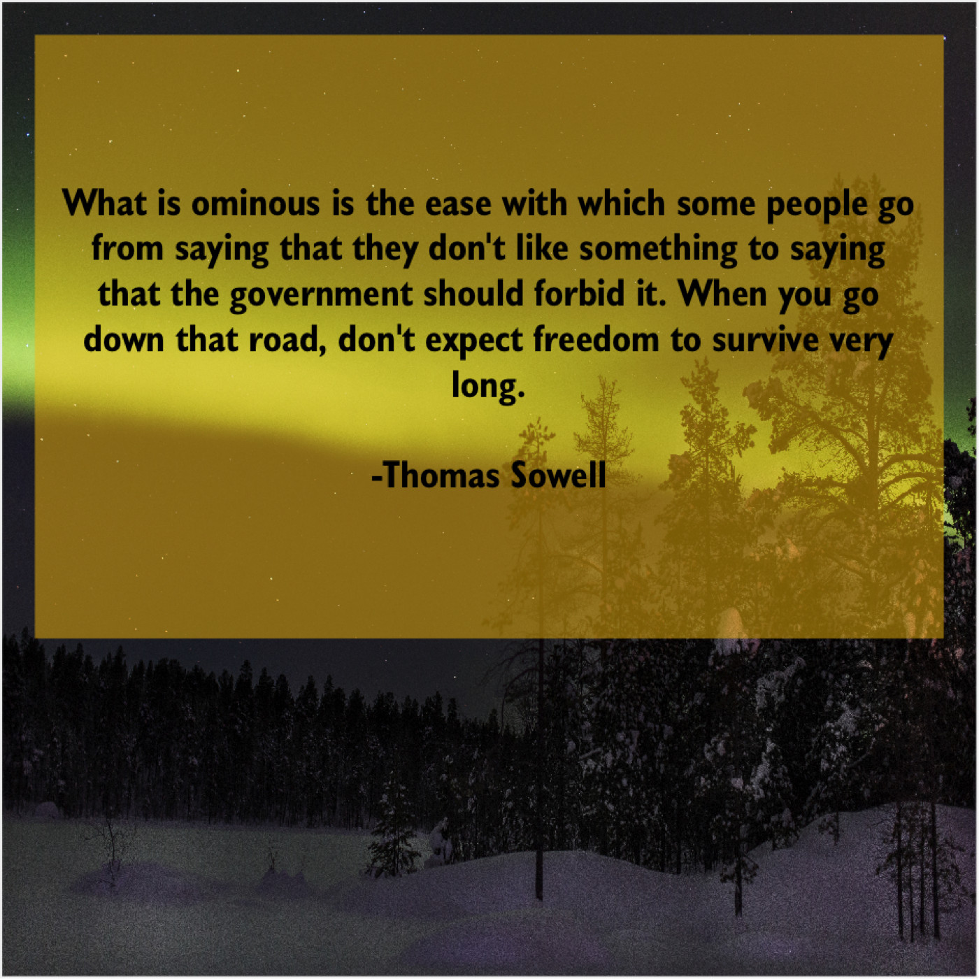 Thomas Sowell Thomas Sowell – What is ominous is the… April 15, 2019 admin “What is ominous is the ease with which some people go from saying that they don’t like something to saying that the government should forbid it. When you go down that road, don’t expect freedom to survive very long.”-Thomas Sowell