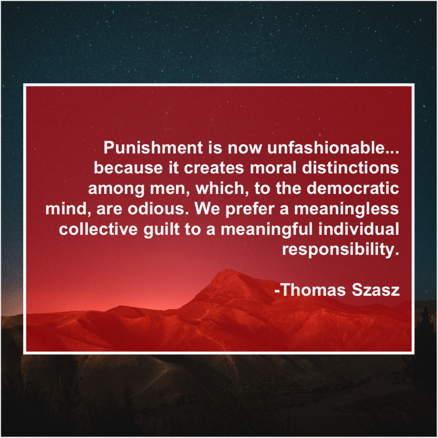 Thomas Szasz Thomas Szasz – Punishment is now unfashionable… because… July 22, 2019 admin “Punishment is now unfashionable… because it creates moral distinctions among men, which, to the democratic mind, are odious. We prefer a meaningless collective guilt to a meaningful individual responsibility.”-Thomas Szasz