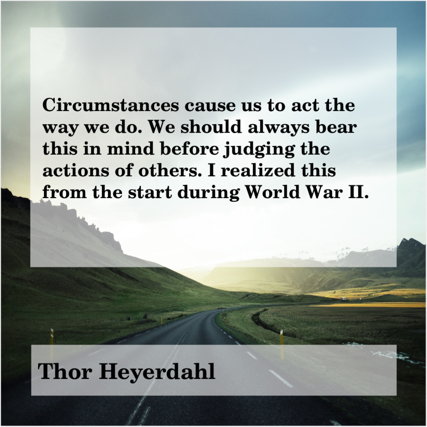 Thor Heyerdahl Thor Heyerdahl – Circumstances cause us to act… July 12, 2019 admin “Circumstances cause us to act the way we do. We should always bear this in mind before judging the actions of others. I realized this from the start during World War II.”-Thor Heyerdahl