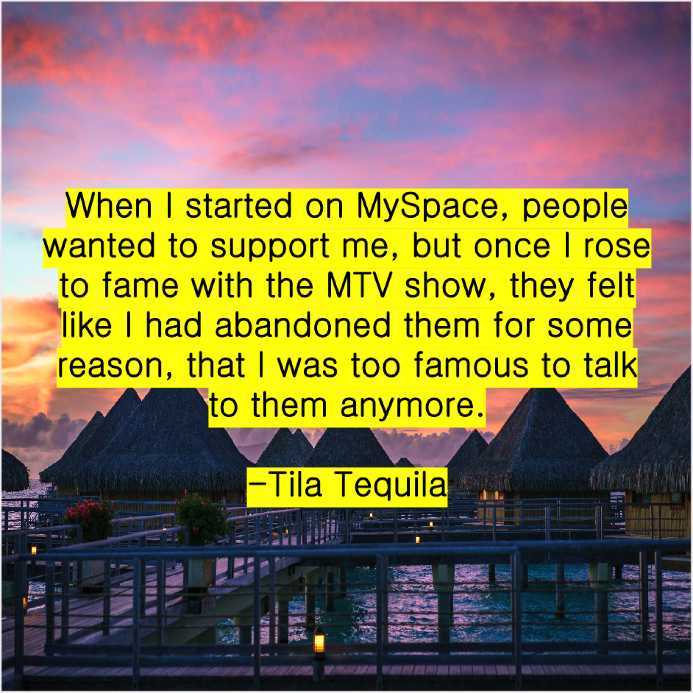 Tila Tequila Tila Tequila – When I started on MySpace… July 11, 2019 admin “When I started on MySpace, people wanted to support me, but once I rose to fame with the MTV show, they felt like I had abandoned them for some reason, that I was too famous to talk to them anymore.”-Tila Tequila