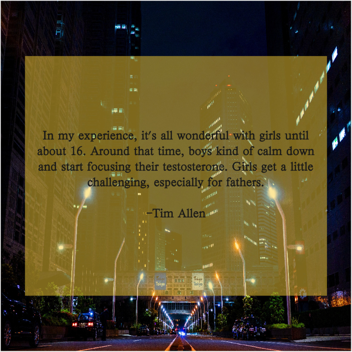 Tim Allen Tim Allen – In my experience, it’s all… May 27, 2019 admin “In my experience, it’s all wonderful with girls until about 16. Around that time, boys kind of calm down and start focusing their testosterone. Girls get a little challenging, especially for fathers.”-Tim Allen