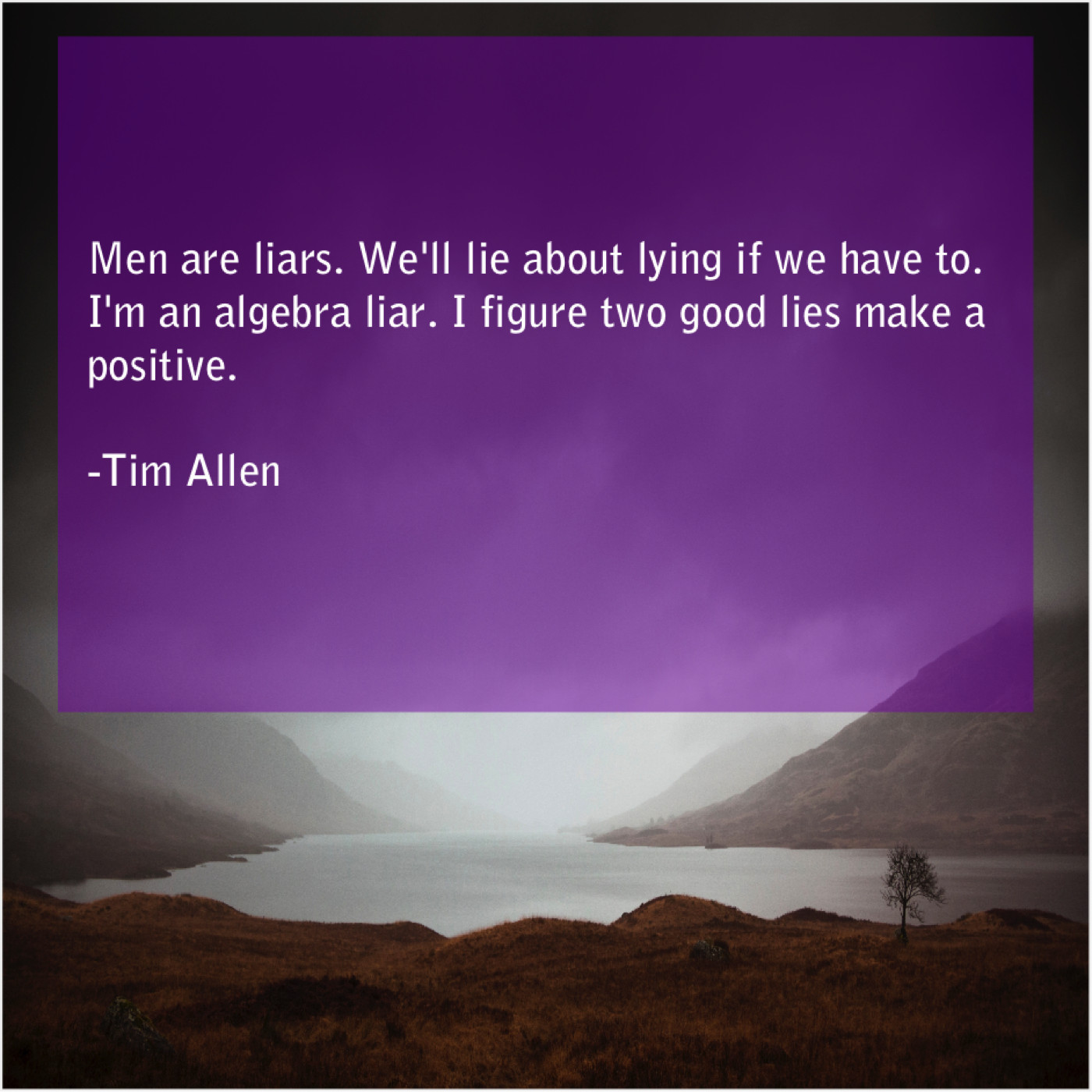 Tim Allen Tim Allen – Men are liars. We’ll lie… July 30, 2019 admin “Men are liars. We’ll lie about lying if we have to. I’m an algebra liar. I figure two good lies make a positive.”-Tim Allen