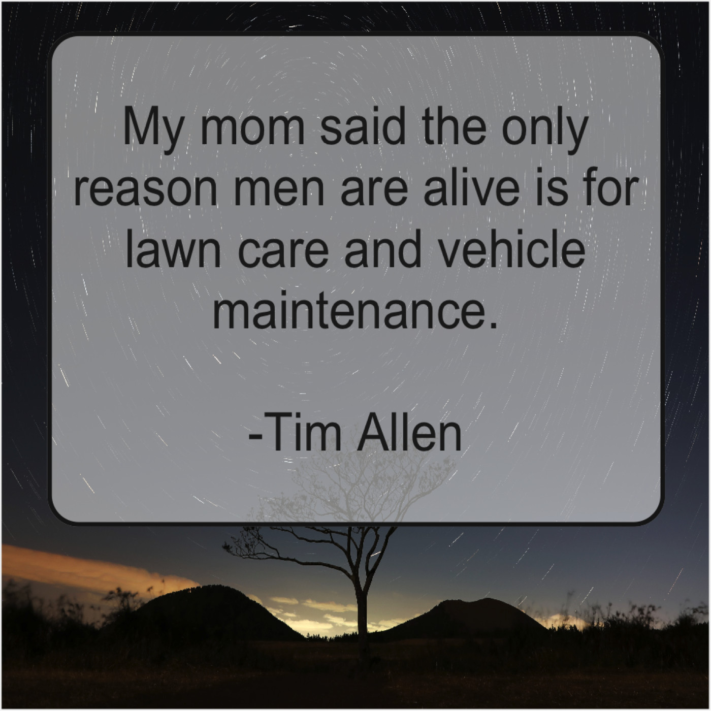 Tim Allen Tim Allen – My mom said the only… January 2, 2019 admin “My mom said the only reason men are alive is for lawn care and vehicle maintenance.”-Tim Allen