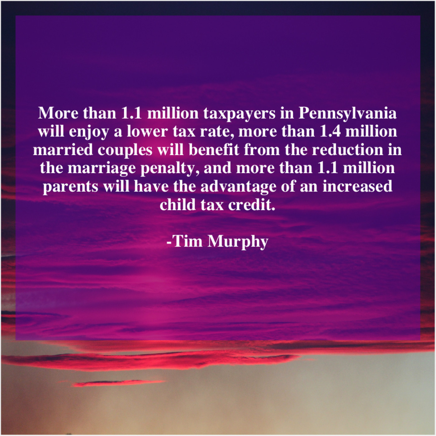 “More than 1.1 million taxpayers in Pennsylvania will enjoy a lower tax rate, more than 1.4 million married couples will benefit from the reduction in the marriage penalty, and more than 1.1 million parents will have the advantage of an increased child tax credit.”