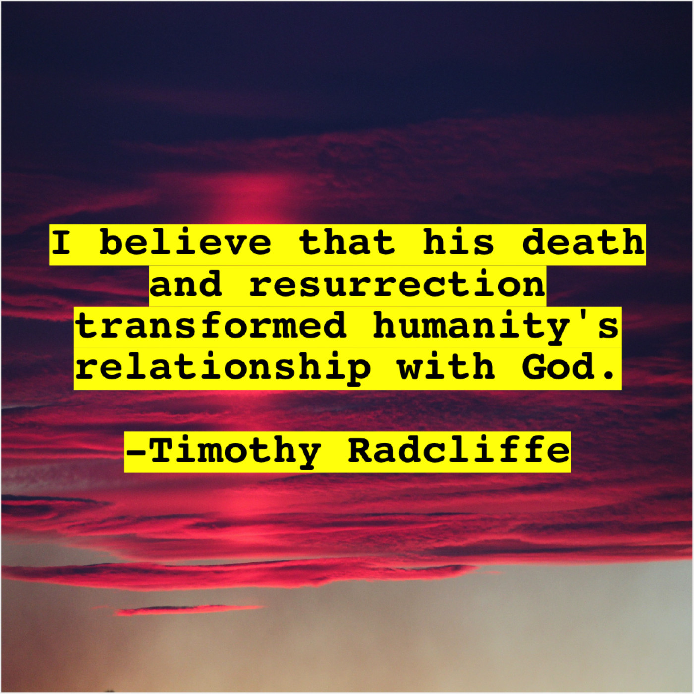 Timothy Radcliffe Timothy Radcliffe – I believe that his death… November 12, 2018 admin “I believe that his death and resurrection transformed humanity’s relationship with God.”-Timothy Radcliffe