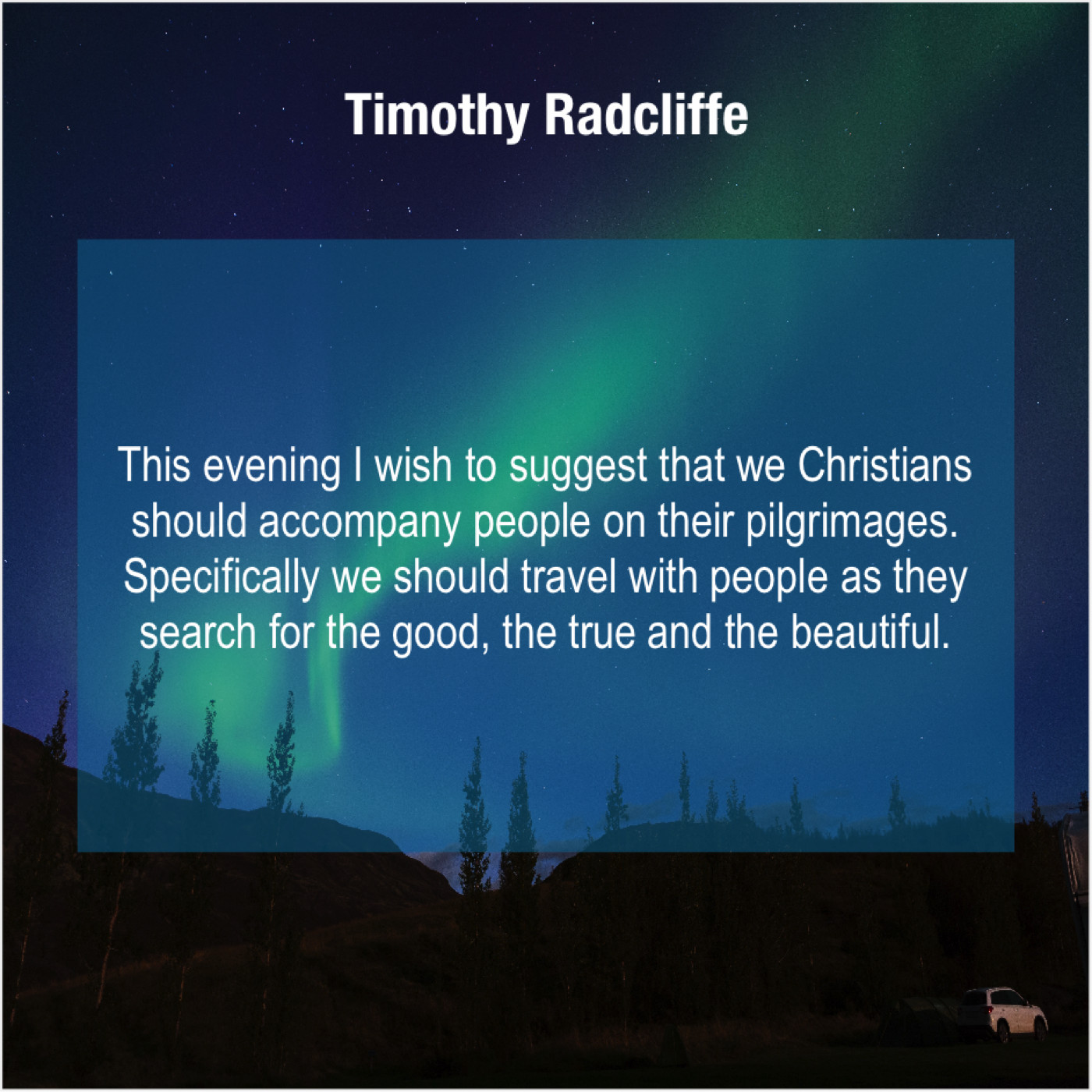 Timothy Radcliffe Timothy Radcliffe – This evening I wish to… July 25, 2019 admin “This evening I wish to suggest that we Christians should accompany people on their pilgrimages. Specifically we should travel with people as they search for the good, the true and the beautiful.”-Timothy Radcliffe