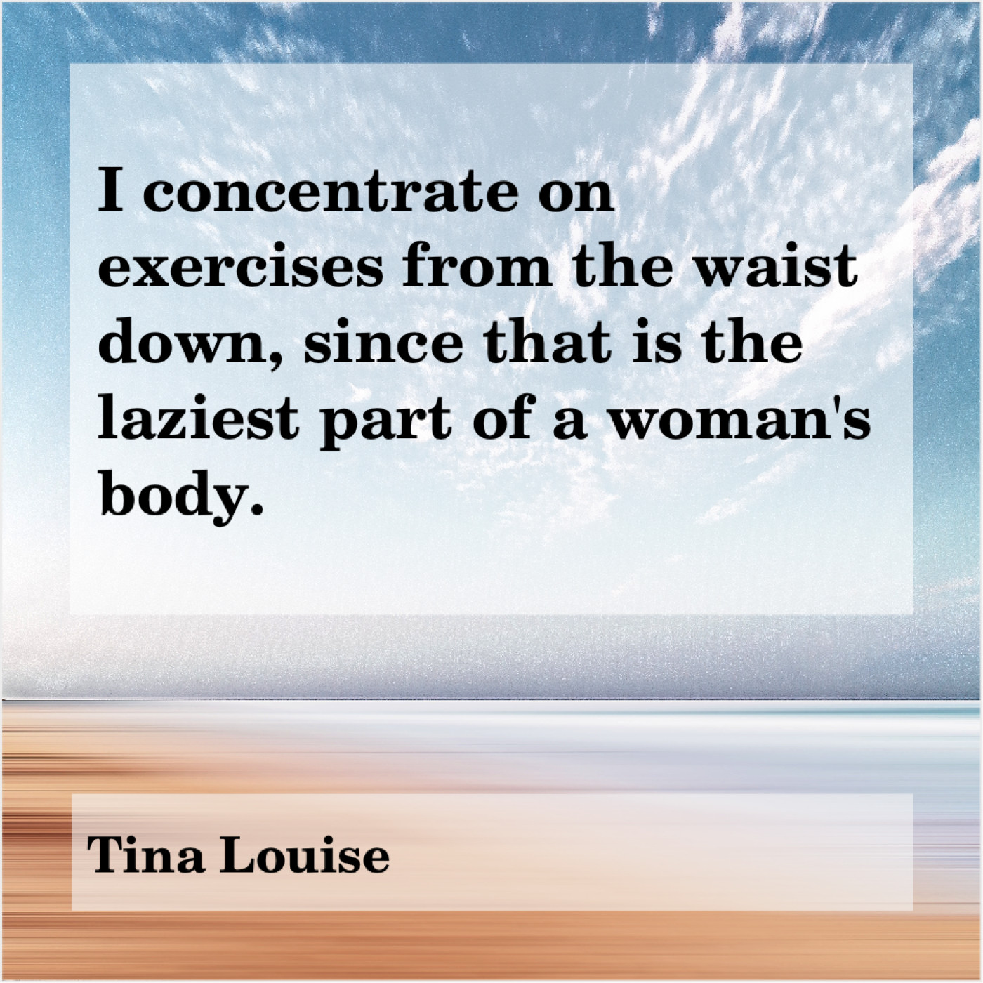 Tina Louise Tina Louise – I concentrate on exercises from… December 6, 2018 admin “I concentrate on exercises from the waist down, since that is the laziest part of a woman’s body.”-Tina Louise