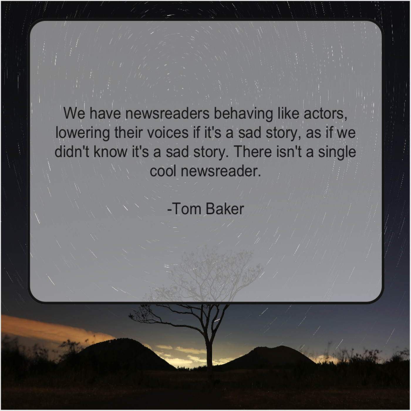Tom Baker Tom Baker – We have newsreaders behaving like… July 22, 2019 admin “We have newsreaders behaving like actors, lowering their voices if it’s a sad story, as if we didn’t know it’s a sad story. There isn’t a single cool newsreader.”-Tom Baker
