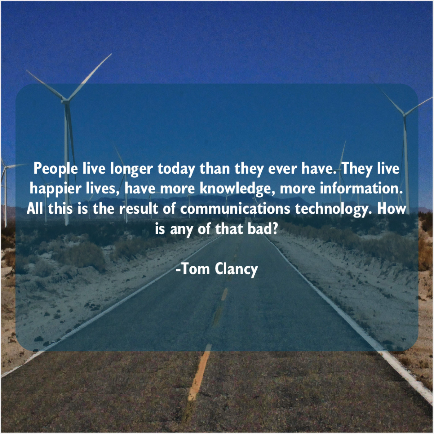Tom Clancy Tom Clancy – People live longer today than… September 11, 2019 admin “People live longer today than they ever have. They live happier lives, have more knowledge, more information. All this is the result of communications technology. How is any of that bad?”-Tom Clancy