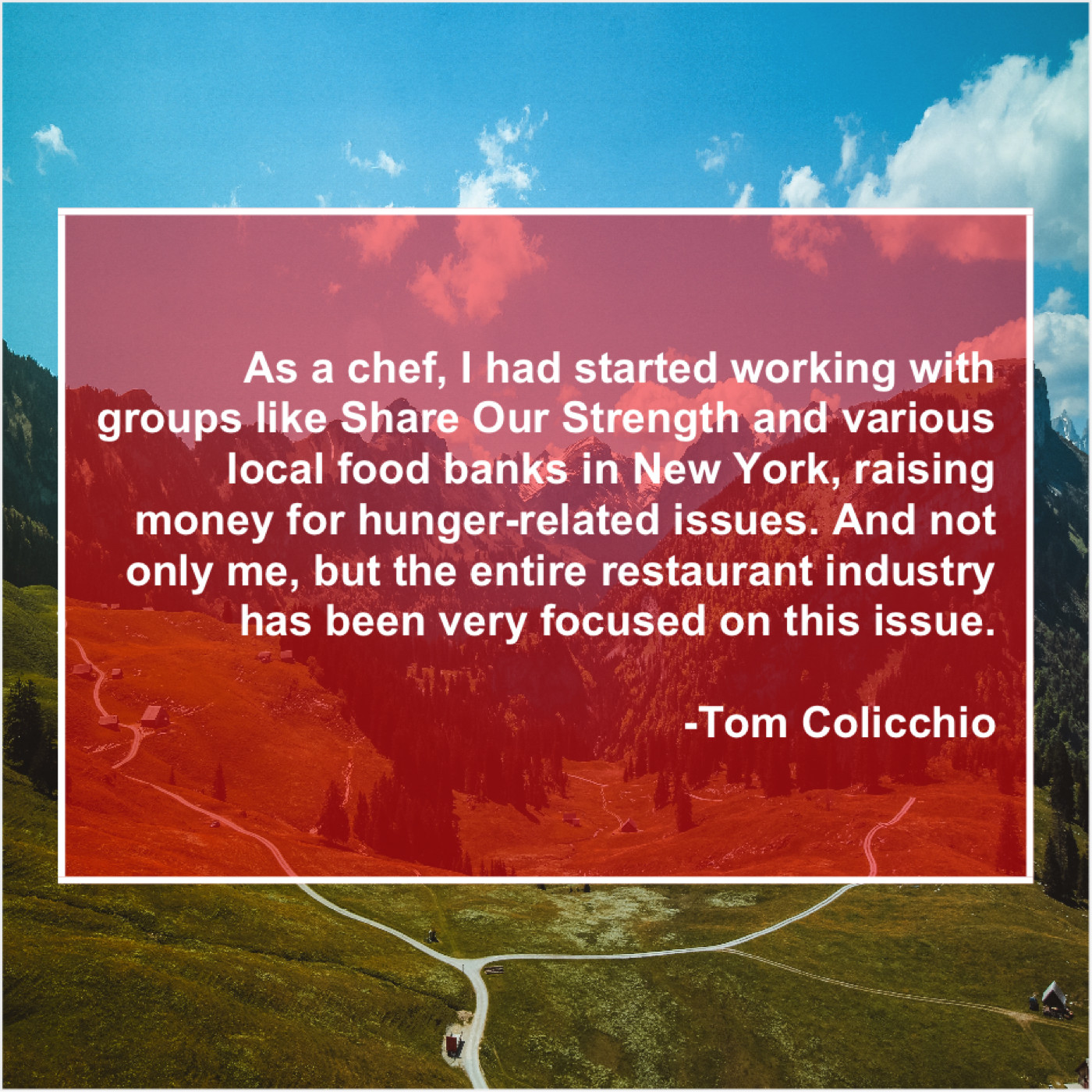 “As a chef, I had started working with groups like Share Our Strength and various local food banks in New York, raising money for hunger-related issues. And not only me, but the entire restaurant industry has been very focused on this issue.”