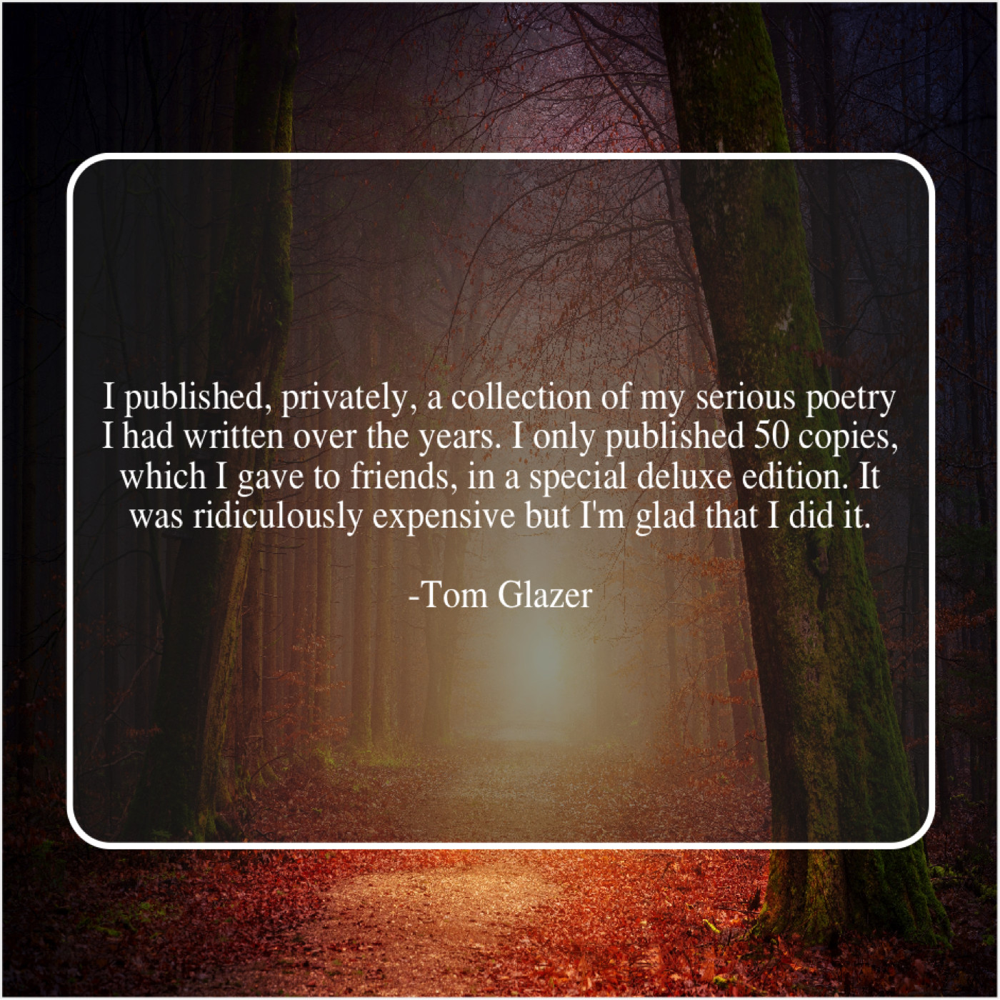Tom Glazer Tom Glazer – I published, privately, a collection… September 10, 2019 admin “I published, privately, a collection of my serious poetry I had written over the years. I only published 50 copies, which I gave to friends, in a special deluxe edition. It was ridiculously expensive but I’m glad that I did it.”-Tom Glazer