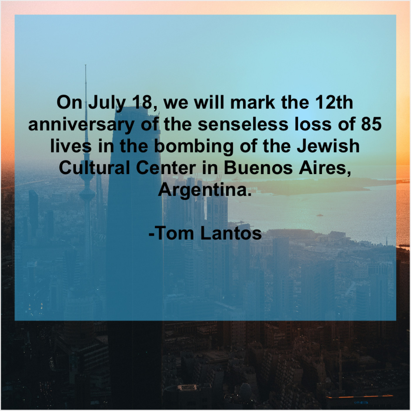 Tom Lantos Tom Lantos – On July 18, we will… March 9, 2019 admin “On July 18, we will mark the 12th anniversary of the senseless loss of 85 lives in the bombing of the Jewish Cultural Center in Buenos Aires, Argentina.”-Tom Lantos