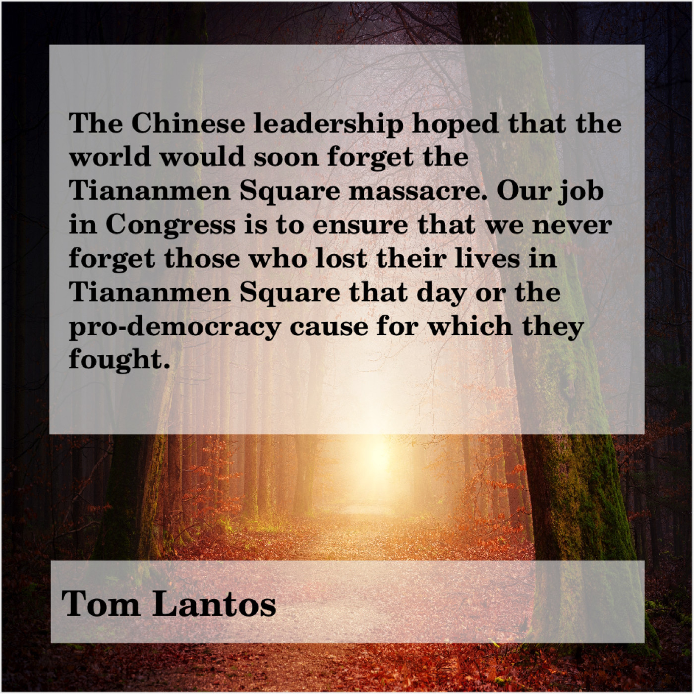 “The Chinese leadership hoped that the world would soon forget the Tiananmen Square massacre. Our job in Congress is to ensure that we never forget those who lost their lives in Tiananmen Square that day or the pro-democracy cause for which they fought.”