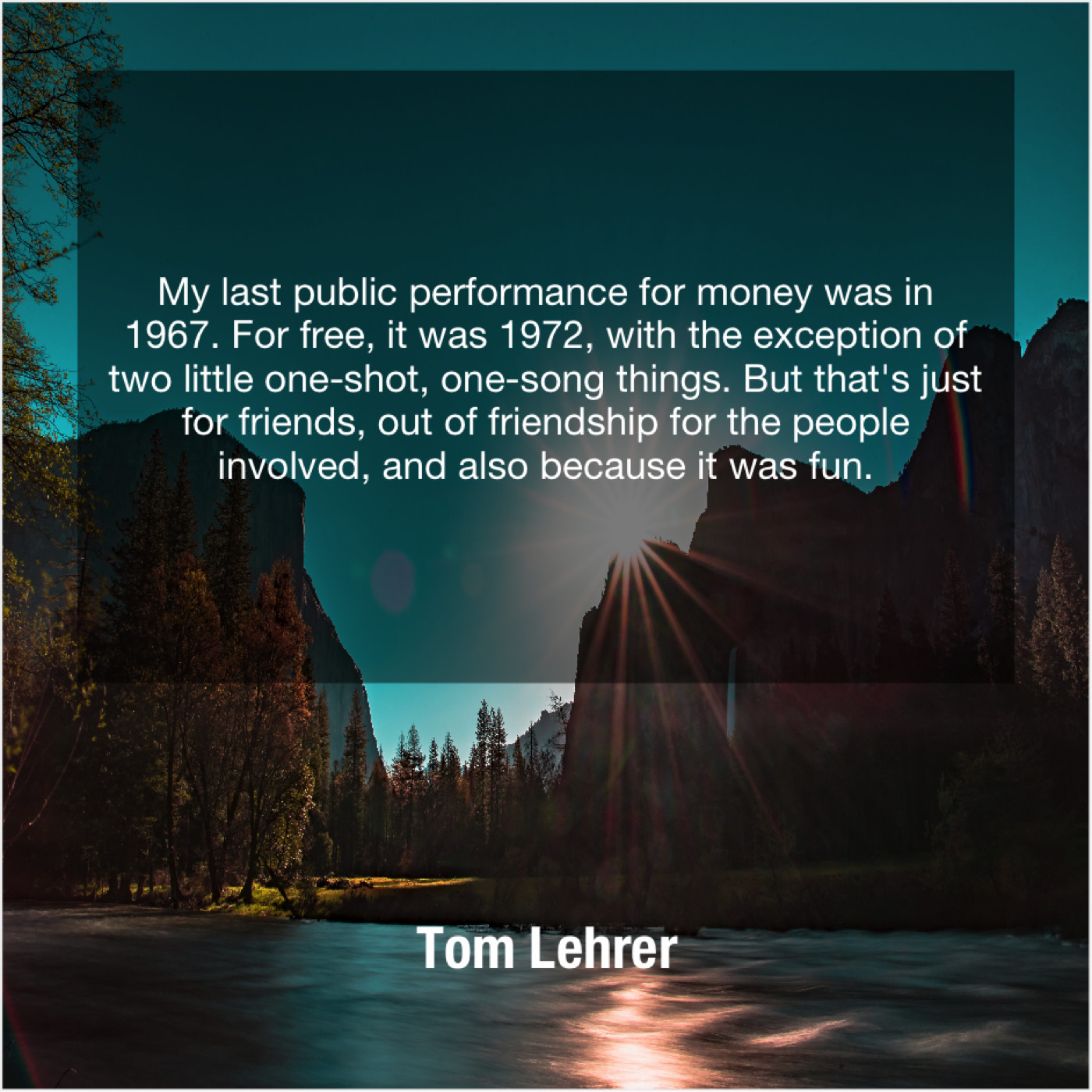 Tom Lehrer Tom Lehrer – My last public performance for… January 1, 2019 admin “My last public performance for money was in 1967. For free, it was 1972, with the exception of two little one-shot, one-song things. But that’s just for friends, out of friendship for the people involved, and also because it was fun.”-Tom Lehrer