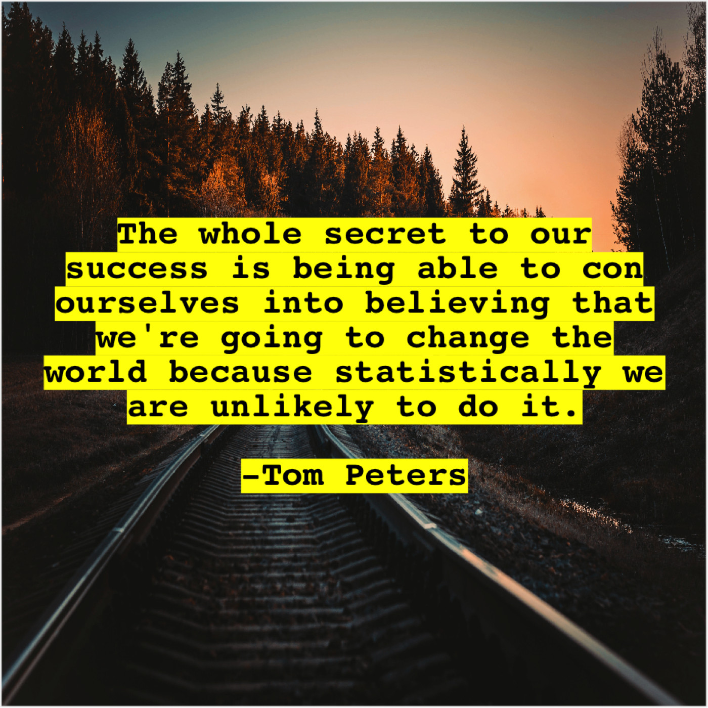 Tom Peters Tom Peters – The whole secret to our… October 30, 2018 admin “The whole secret to our success is being able to con ourselves into believing that we’re going to change the world because statistically we are unlikely to do it.”-Tom Peters