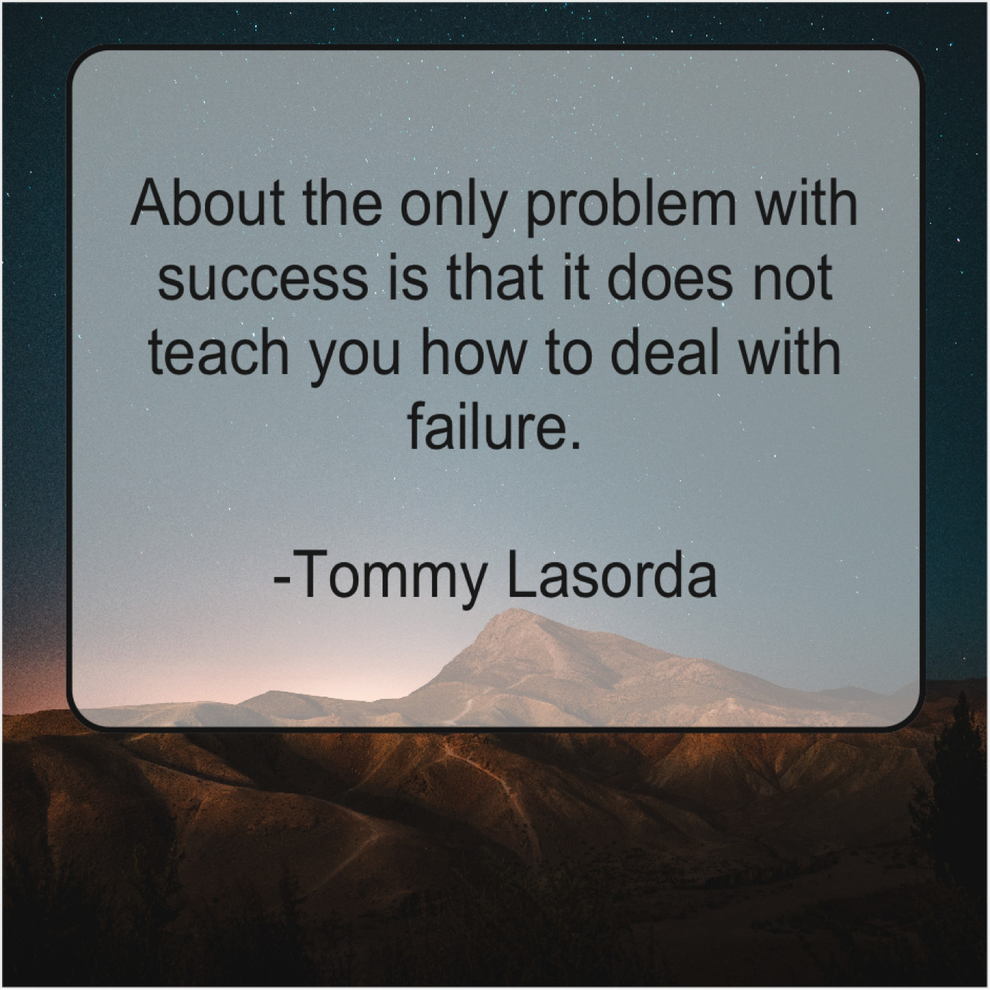 Tommy Lasorda Tommy Lasorda – About the only problem with… March 14, 2019 admin “About the only problem with success is that it does not teach you how to deal with failure.”-Tommy Lasorda