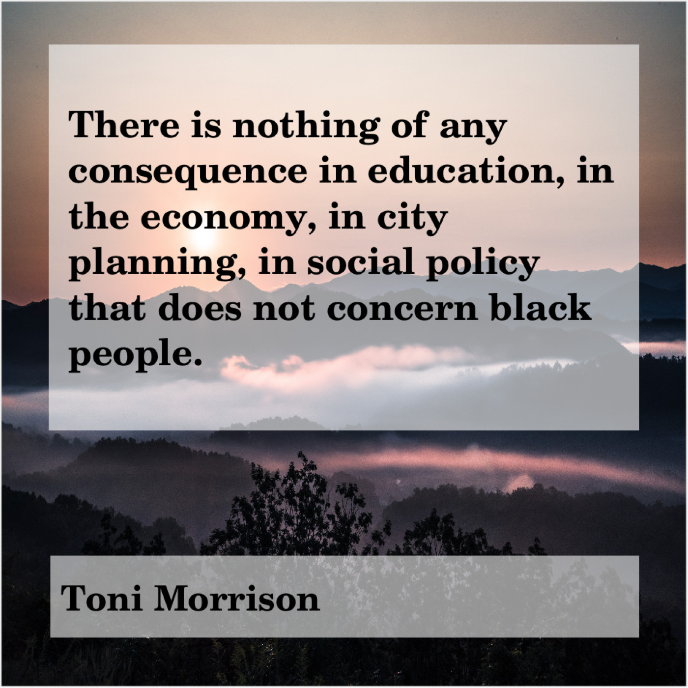 Toni Morrison Toni Morrison – There is nothing of any… July 25, 2019 admin “There is nothing of any consequence in education, in the economy, in city planning, in social policy that does not concern black people.”-Toni Morrison