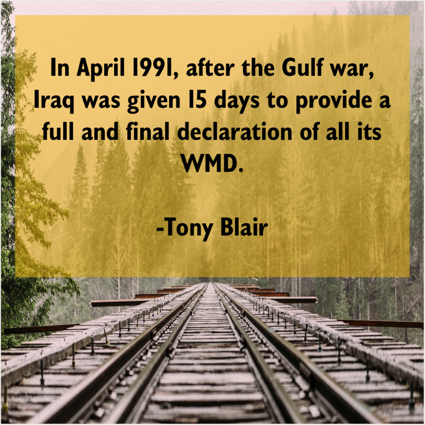 Tony Blair Tony Blair – In April 1991, after the… November 28, 2018 admin “In April 1991, after the Gulf war, Iraq was given 15 days to provide a full and final declaration of all its WMD.”-Tony Blair