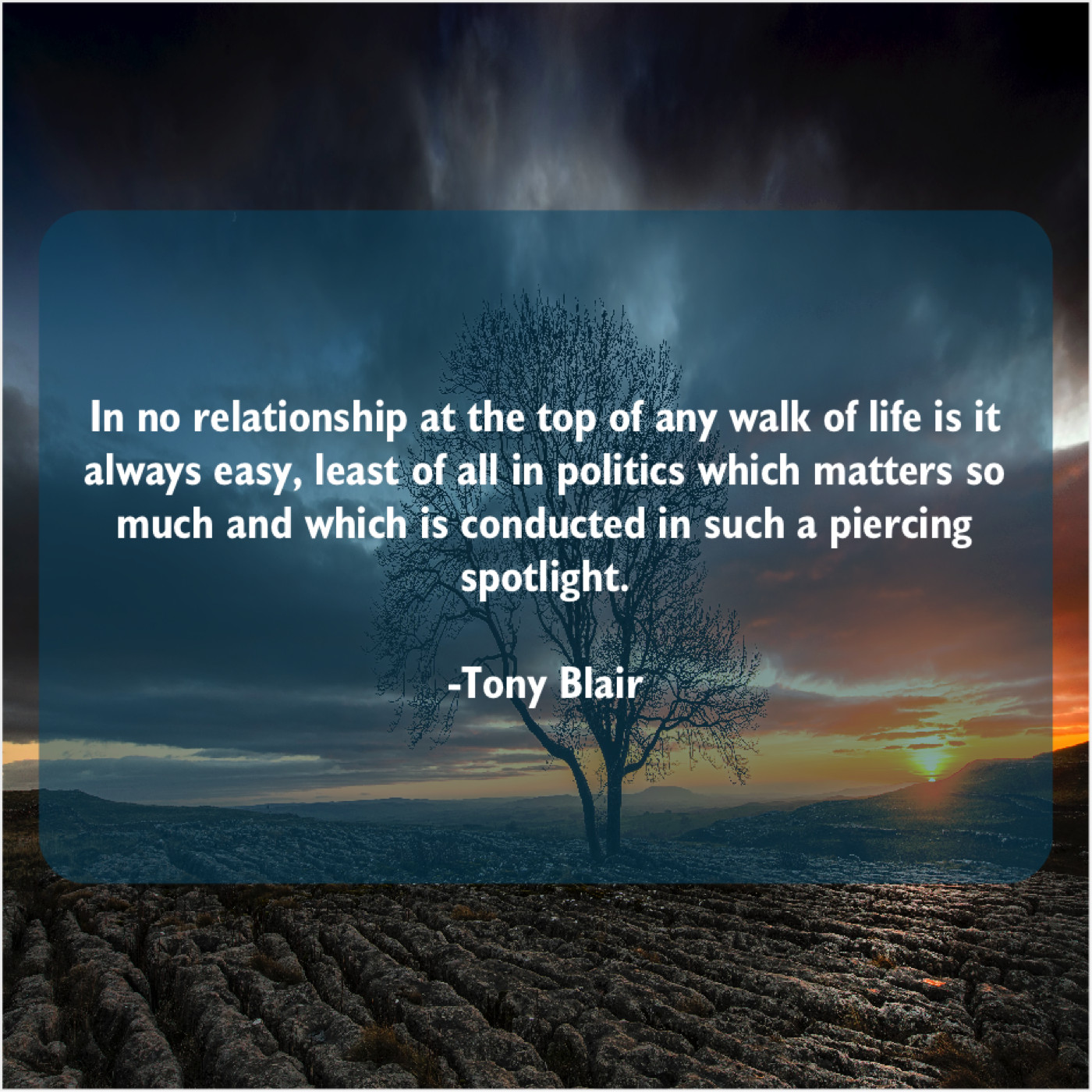 Tony Blair Tony Blair – In no relationship at the… June 19, 2019 admin “In no relationship at the top of any walk of life is it always easy, least of all in politics which matters so much and which is conducted in such a piercing spotlight.”-Tony Blair