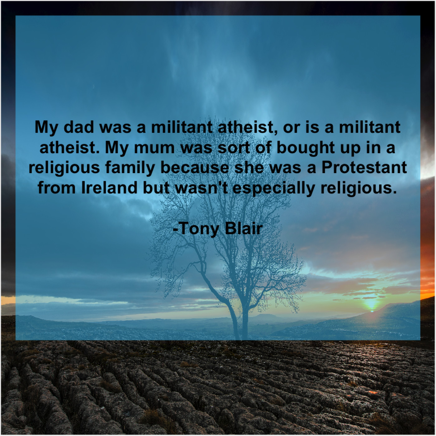 Tony Blair Tony Blair – My dad was a militant… May 10, 2019 admin “My dad was a militant atheist, or is a militant atheist. My mum was sort of bought up in a religious family because she was a Protestant from Ireland but wasn’t especially religious.”-Tony Blair