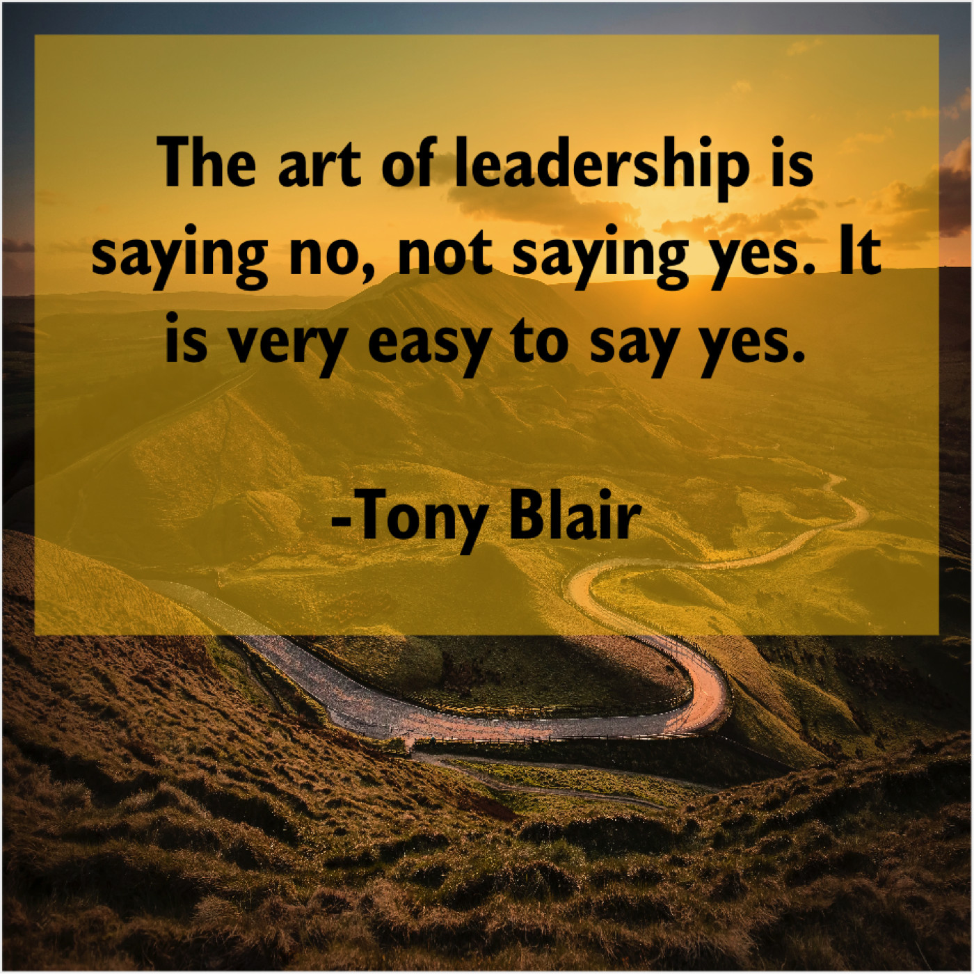 Tony Blair Tony Blair – The art of leadership is… August 8, 2019 admin “The art of leadership is saying no, not saying yes. It is very easy to say yes.”-Tony Blair