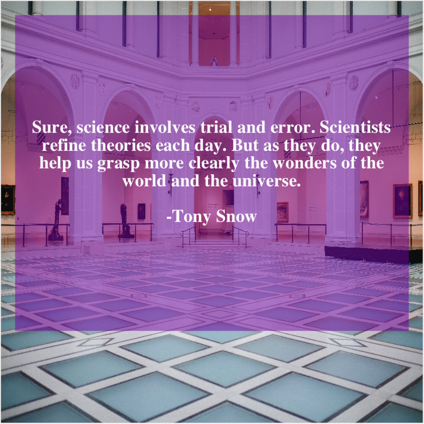 Tony Snow Tony Snow – Sure, science involves trial and… June 2, 2019 admin “Sure, science involves trial and error. Scientists refine theories each day. But as they do, they help us grasp more clearly the wonders of the world and the universe.”-Tony Snow