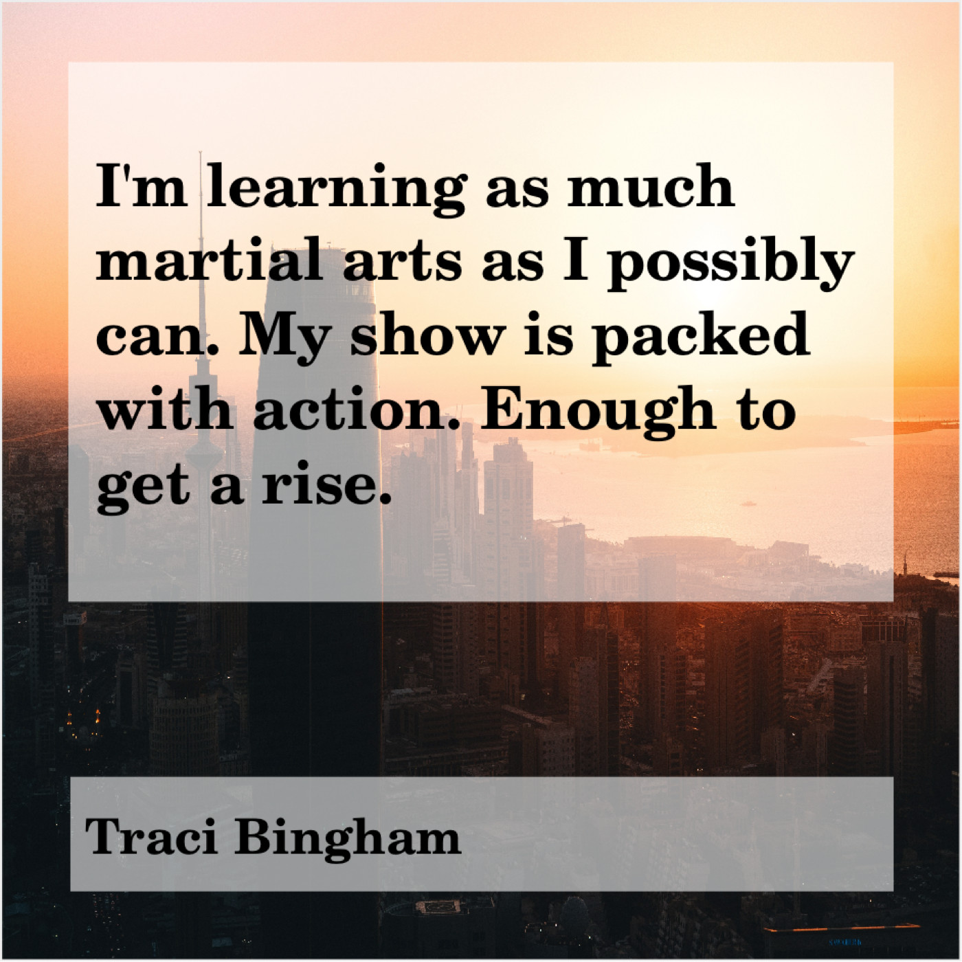 Traci Bingham Traci Bingham – I’m learning as much martial… November 22, 2018 admin “I’m learning as much martial arts as I possibly can. My show is packed with action. Enough to get a rise.”-Traci Bingham