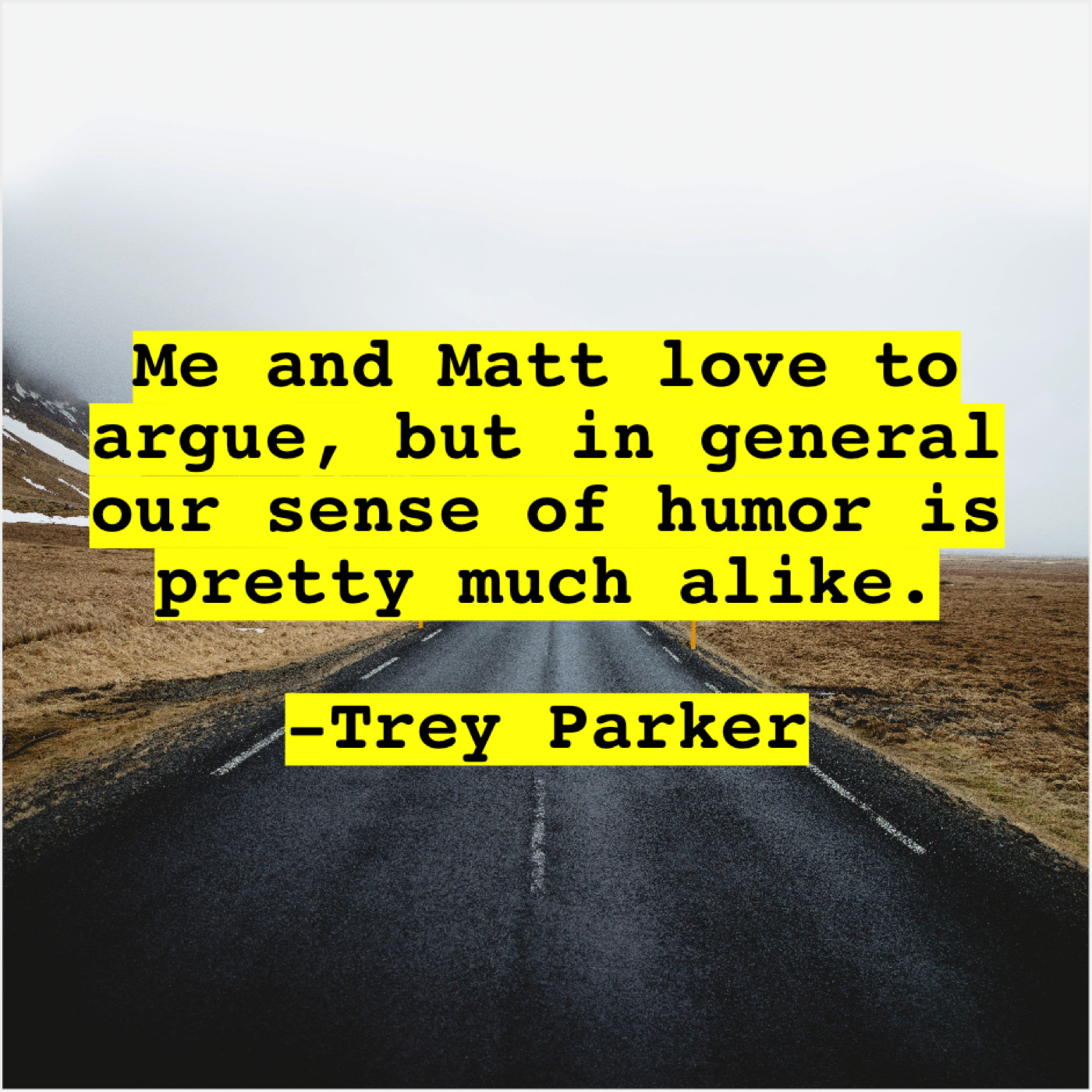 Trey Parker Trey Parker – Me and Matt love to… June 27, 2019 admin “Me and Matt love to argue, but in general our sense of humor is pretty much alike.”-Trey Parker