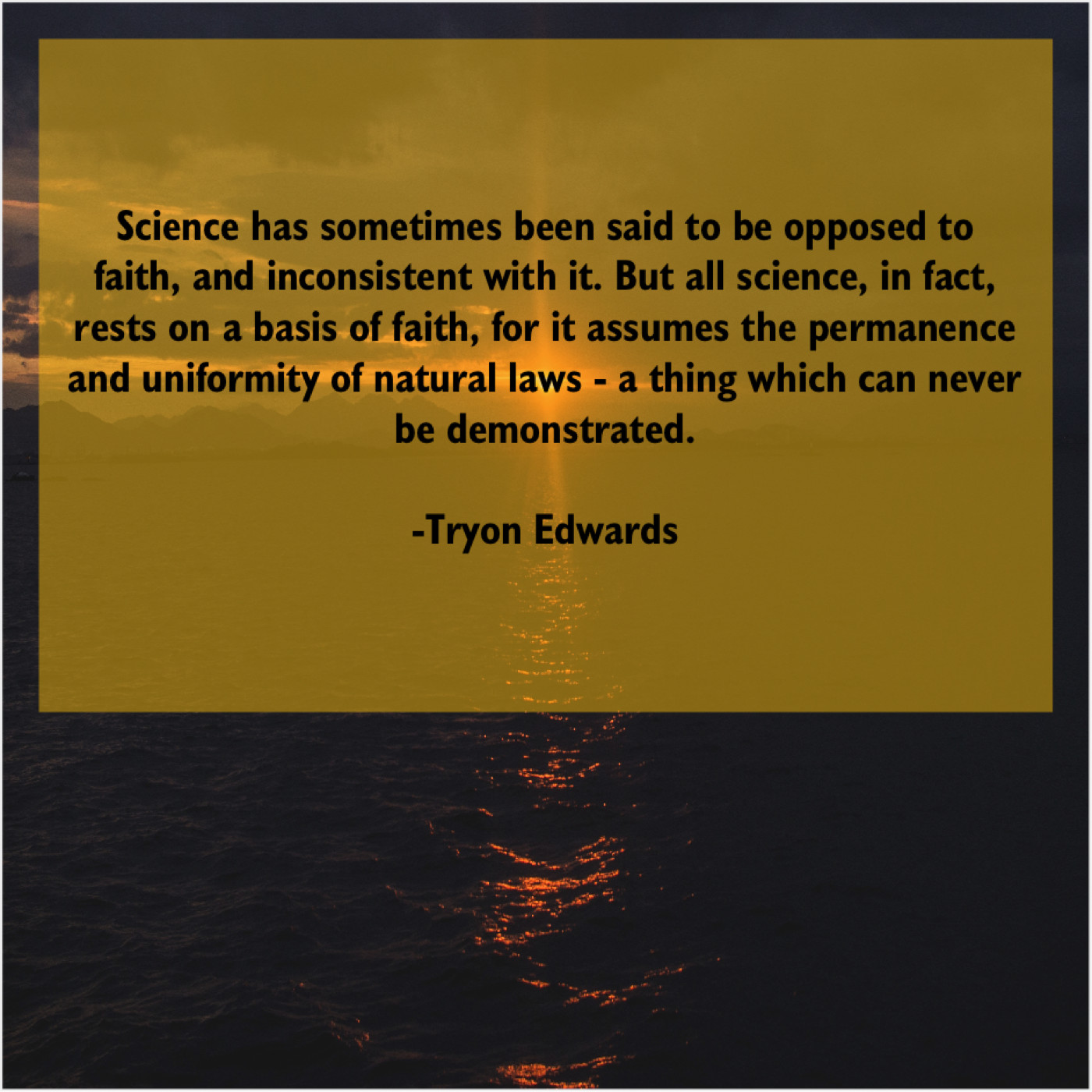 “Science has sometimes been said to be opposed to faith, and inconsistent with it. But all science, in fact, rests on a basis of faith, for it assumes the permanence and uniformity of natural laws – a thing which can never be demonstrated.”