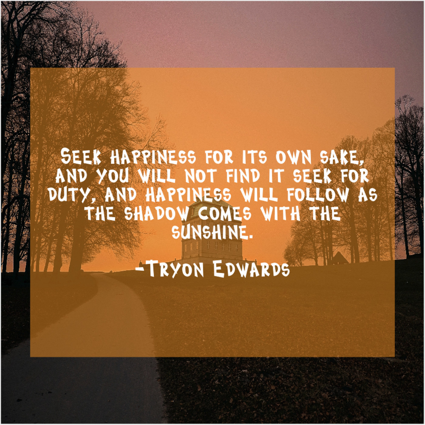 Tryon Edwards Tryon Edwards – Seek happiness for its own… March 1, 2019 admin “Seek happiness for its own sake, and you will not find it seek for duty, and happiness will follow as the shadow comes with the sunshine.”-Tryon Edwards
