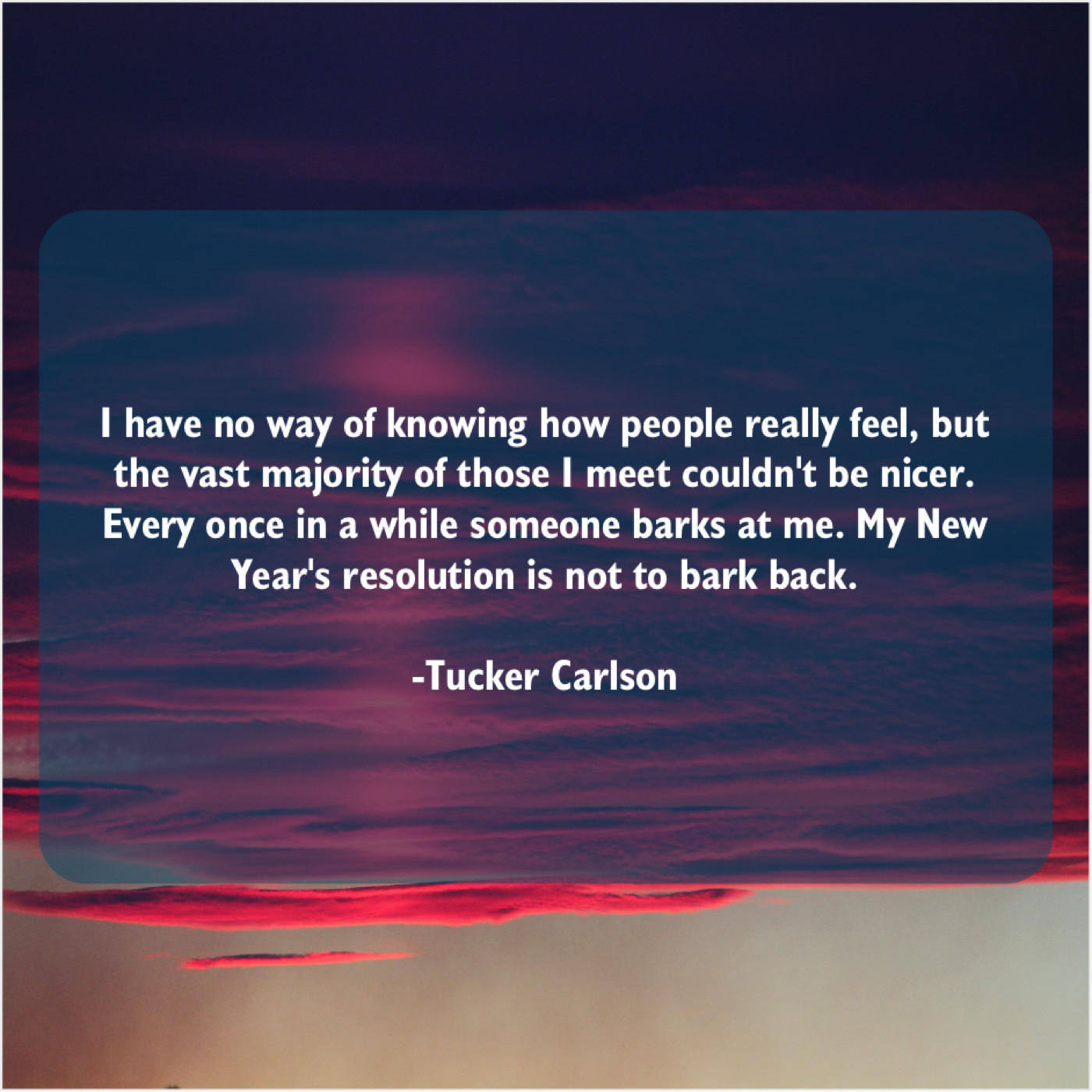 Tucker Carlson Tucker Carlson – I have no way of… February 22, 2019 admin “I have no way of knowing how people really feel, but the vast majority of those I meet couldn’t be nicer. Every once in a while someone barks at me. My New Year’s resolution is not to bark back.”-Tucker Carlson