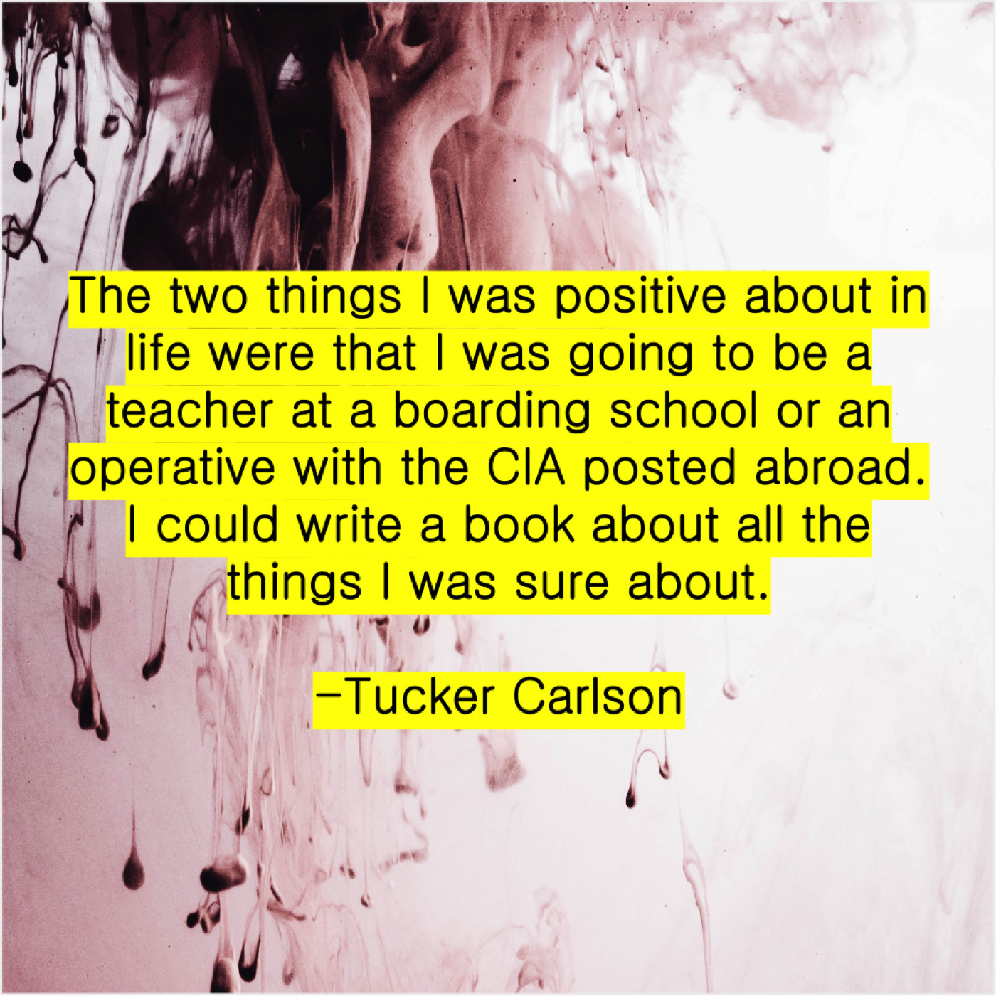 Tucker Carlson Tucker Carlson – The two things I was… May 31, 2019 admin “The two things I was positive about in life were that I was going to be a teacher at a boarding school or an operative with the CIA posted abroad. I could write a book about all the things I was sure about.”-Tucker Carlson