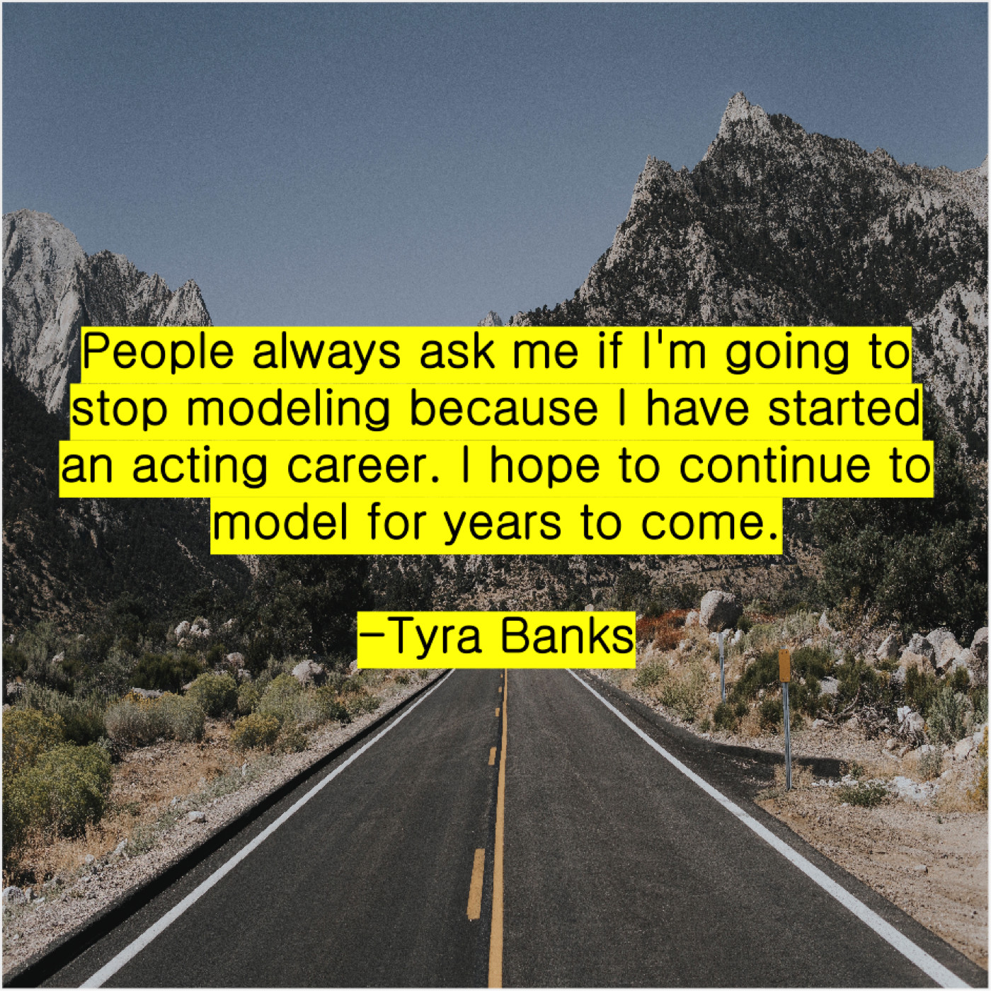 Tyra Banks Tyra Banks – People always ask me if… April 9, 2019 admin “People always ask me if I’m going to stop modeling because I have started an acting career. I hope to continue to model for years to come.”-Tyra Banks