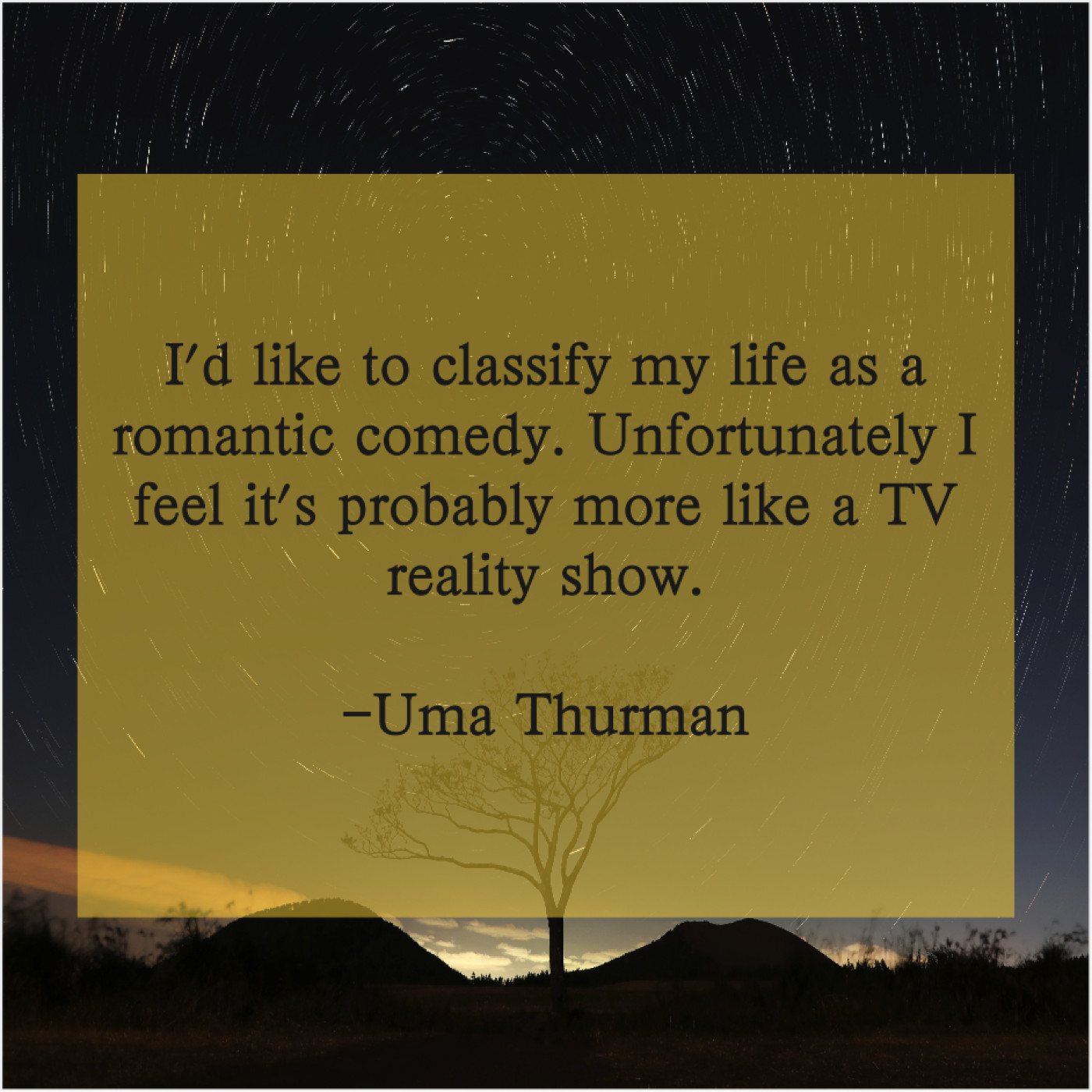 Uma Thurman Uma Thurman – I’d like to classify my… August 28, 2019 admin “I’d like to classify my life as a romantic comedy. Unfortunately I feel it’s probably more like a TV reality show.”-Uma Thurman
