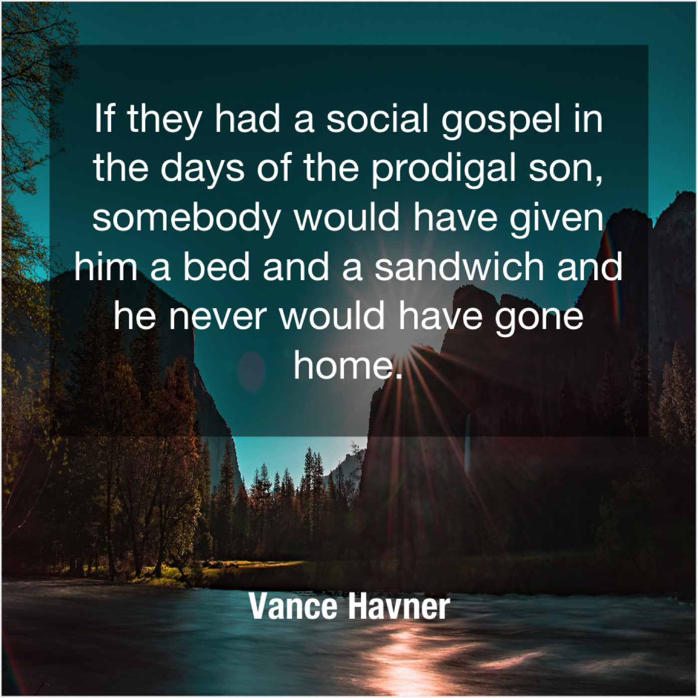 Vance Havner Vance Havner – If they had a social… August 27, 2019 admin “If they had a social gospel in the days of the prodigal son, somebody would have given him a bed and a sandwich and he never would have gone home.”-Vance Havner
