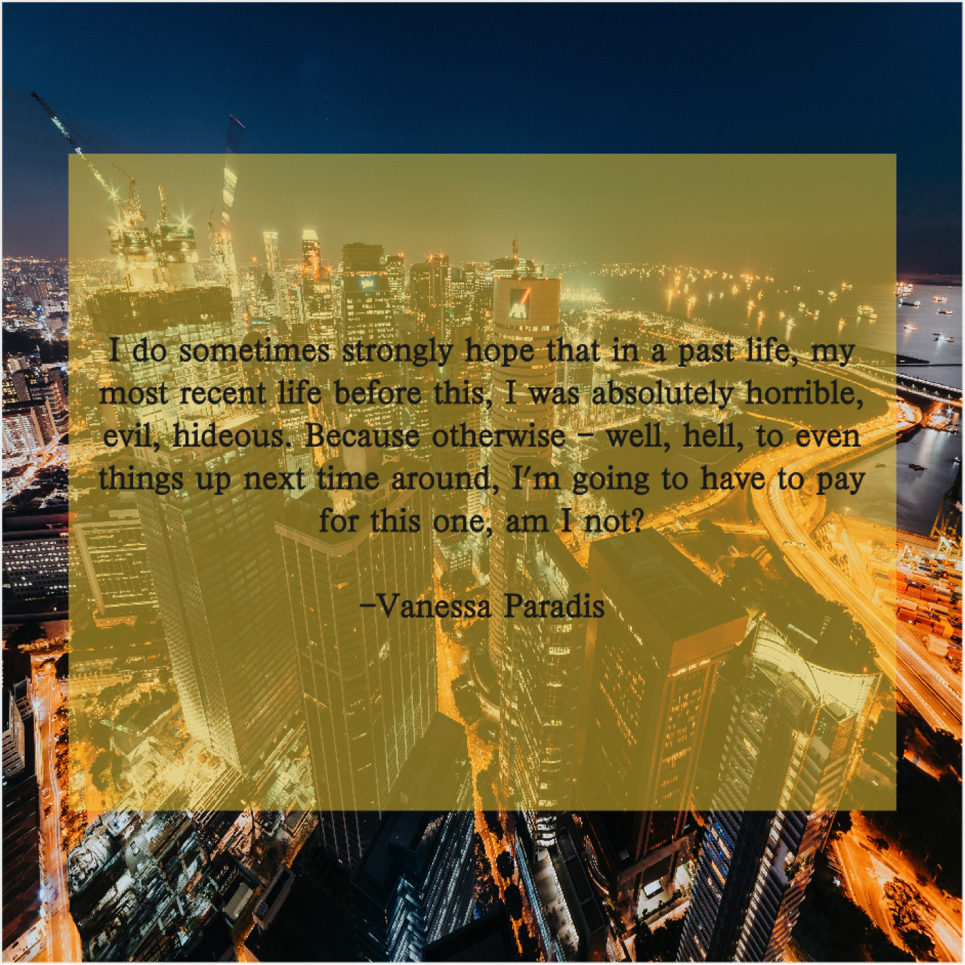 “I do sometimes strongly hope that in a past life, my most recent life before this, I was absolutely horrible, evil, hideous. Because otherwise – well, hell, to even things up next time around, I’m going to have to pay for this one, am I not?”