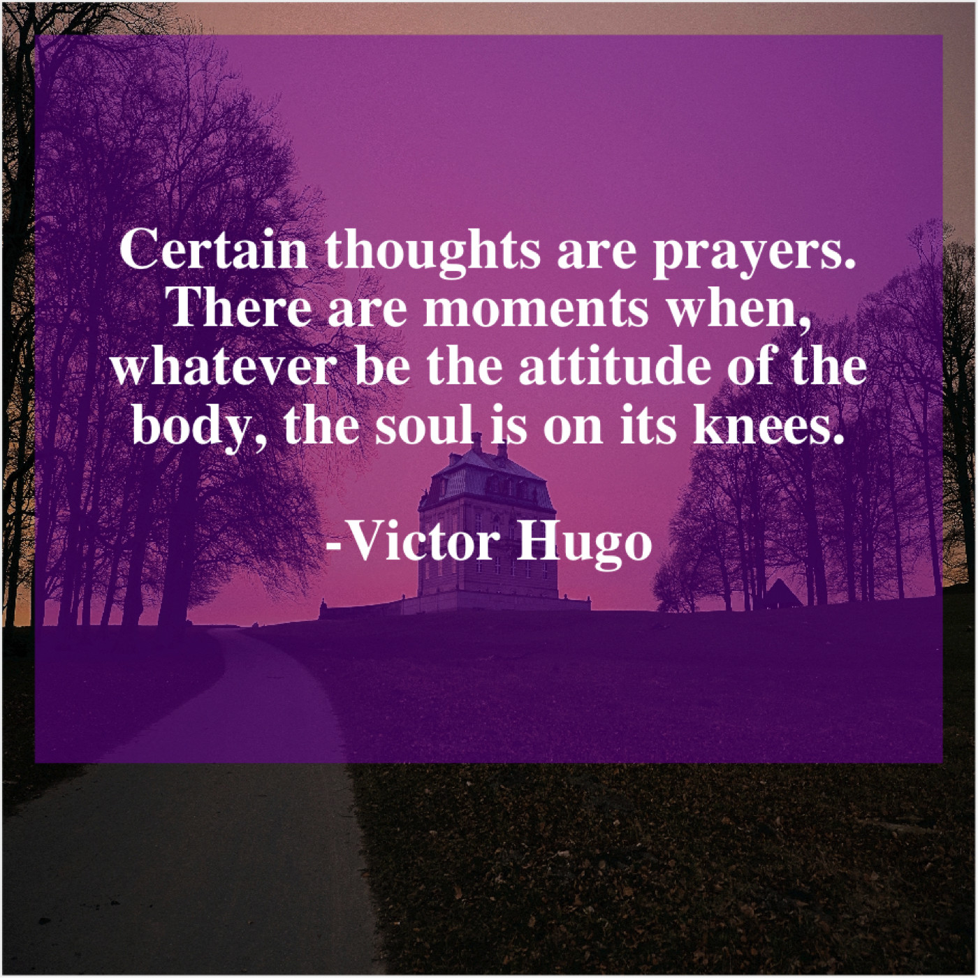 Victor Hugo Victor Hugo – Certain thoughts are prayers. There… April 2, 2019 admin “Certain thoughts are prayers. There are moments when, whatever be the attitude of the body, the soul is on its knees.”-Victor Hugo