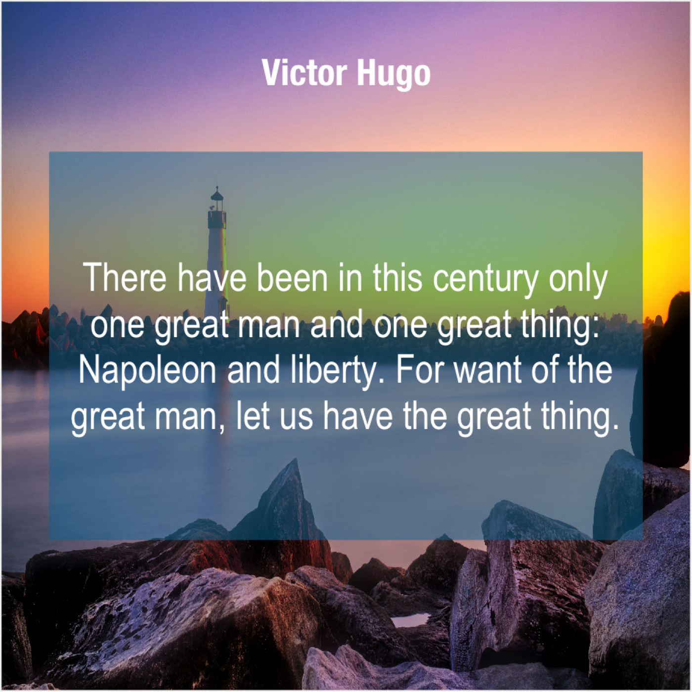 Victor Hugo Victor Hugo – There have been in this… March 27, 2019 admin “There have been in this century only one great man and one great thing: Napoleon and liberty. For want of the great man, let us have the great thing.”-Victor Hugo