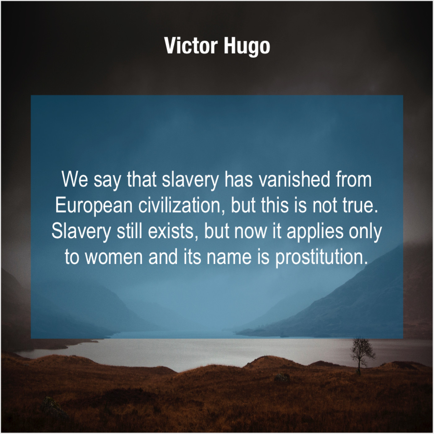 Victor Hugo Victor Hugo – We say that slavery has… December 7, 2018 admin “We say that slavery has vanished from European civilization, but this is not true. Slavery still exists, but now it applies only to women and its name is prostitution.”-Victor Hugo