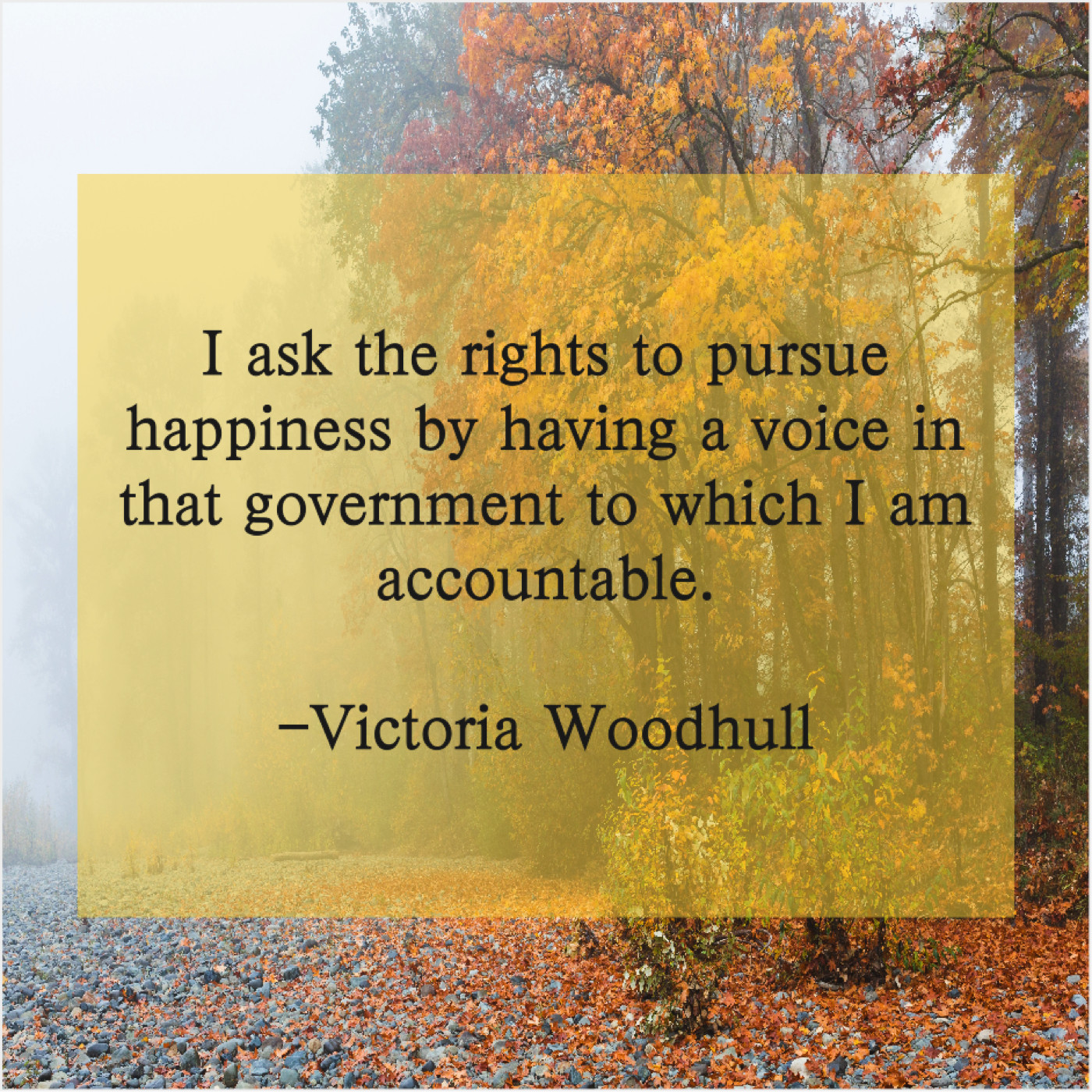 Victoria Woodhull Victoria Woodhull – I ask the rights to… May 23, 2019 admin “I ask the rights to pursue happiness by having a voice in that government to which I am accountable.”-Victoria Woodhull